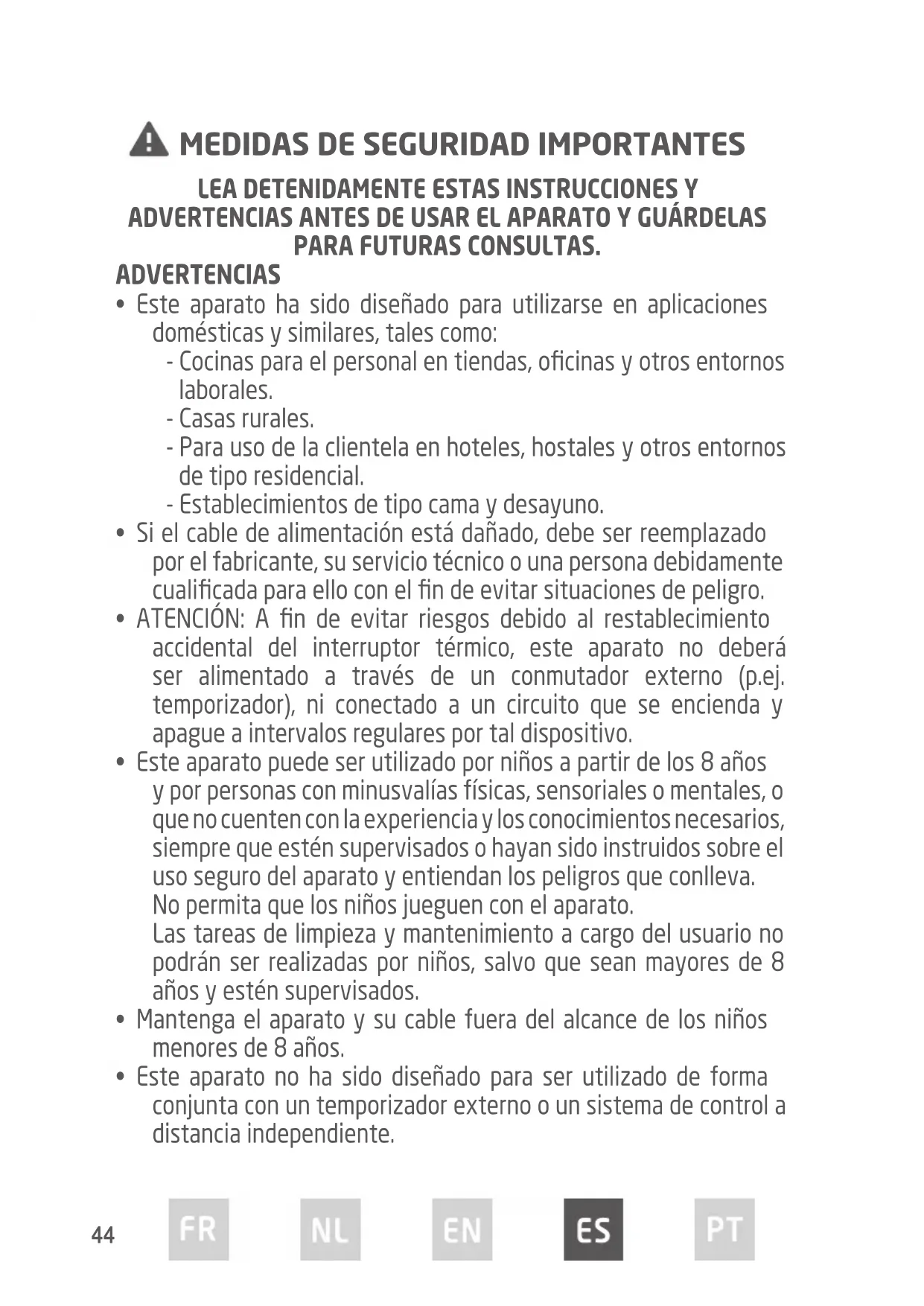 ADVERTENCIAS ANTES DE USAR EL APARATO Y GUÁRDELAS PARA FUTURAS CONSULTAS. ADVERTENCIAS