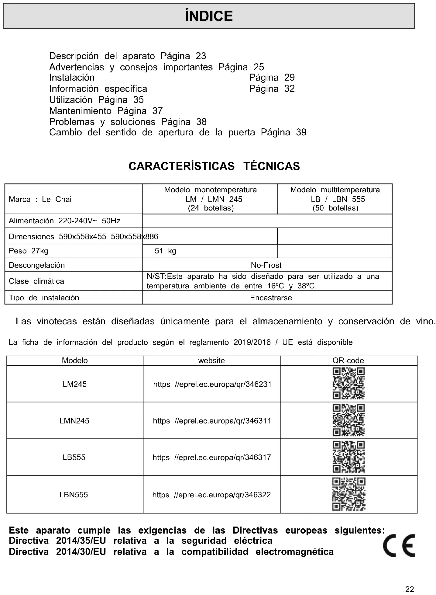 Marca : Le Chai Modelo monotemperatura LM / LMN 245 (24 botellas) Modelo multitemperatura LB / LBN 555 (50 botellas) Alimentación 220-240V~ 50Hz Dimensiones 590x558x455 590x558x886 Peso 27kg 51 kg Descongelación No-Frost Clase climática N/ST:Este aparato ha sido diseñado para ser utilizado a una temperatura ambiente de entre 16ºC y 38ºC. Tipo de instalación Encastrarse Las vinotecas están diseñadas únicamente para el almacenamiento y conservación de vino. La ficha de información del producto según el reglamento 2019/2016 / UE está disponible Modelo website QR-code LM245 https //eprel.ec.europa/qr/346231 LMN245 https //eprel.ec.europa/qr/346311 LB555 https //eprel.ec.europa/qr/346317 LBN555 https //eprel.ec.europa/qr/346322 Este aparato cumple las exigencias de las Directivas europeas siguientes: Directiva 2014/35/EU relativa a la seguridad eléctrica Directiva 2014/30/EU relativa a la compatibilidad electromagnética23