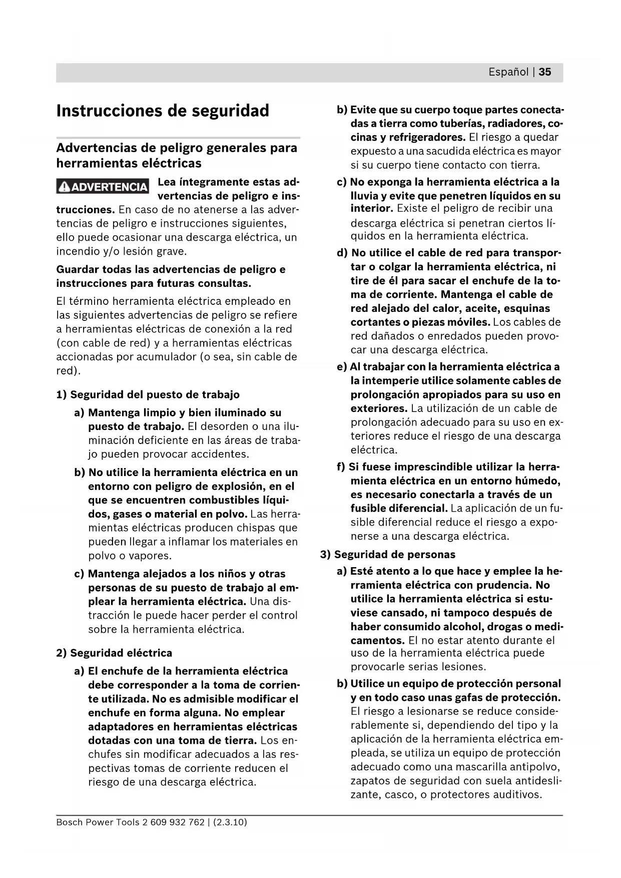 a) Esté atento a lo que hace y emplee la he- rramienta eléctrica con prudencia. No utilice la herramienta eléctrica si estu- viese cansado, ni tampoco después de haber consumido alcohol, drogas o medi- camentos. El no estar atento durante el uso de la herramienta eléctrica puede provocarle serias lesiones. b) Utilice un equipo de protección personal y en todo caso unas gafas de protección. El riesgo a lesionarse se reduce conside- rablemente si, dependiendo del tipo y la aplicación de la herramienta eléctrica em- pleada, se utiliza un equipo de protección adecuado como una mascarilla antipolvo, zapatos de seguridad con suela antidesli- zante, casco, o protectores auditivos. ADVERTENCIA OBJ_BUCH-824-002.book Page 35 Tuesday, March 2, 2010 9:44 AM36 | Español 2 609 932 762 | (2.3.10) Bosch Power Tools c) Evite una puesta en marcha fortuita. Asegurarse de que la herramienta eléc- trica esté desconectada antes de conec- tarla a la toma de corriente y/o al montar el acumulador, al recogerla, y al trans- portarla. Si transporta la herramienta eléctrica sujetándola por el interruptor de conexión/desconexión, o si alimenta la herramienta eléctrica estando ésta conec- tada, ello puede dar lugar a un accidente. d) Retire las herramientas de ajuste o lla- ves fijas antes de conectar la herramien- ta eléctrica. Una herramienta de ajuste o llave fija colocada en una pieza rotante puede producir lesiones al poner a funcio- nar la herramienta eléctrica. e) Evite posturas arriesgadas. Trabaje so- bre una base firme y mantenga el equili- brio en todo momento. Ello le permitirá controlar mejor la herramienta eléctrica en caso de presentarse una situación in- esperada. f) Lleve puesta una vestimenta de trabajo adecuada. No utilice vestimenta amplia ni joyas. Mantenga su pelo, vestimenta y guantes alejados de las piezas móviles. La vestimenta suelta, el pelo largo y las jo- yas se pueden enganchar con las piezas en movimiento. g) Siempre que sea posible utilizar unos equipos de aspiración o captación de polvo, asegúrese que éstos estén monta- dos y que sean utilizados correctamente. El empleo de estos equipos reduce los riesgos derivados del polvo.
