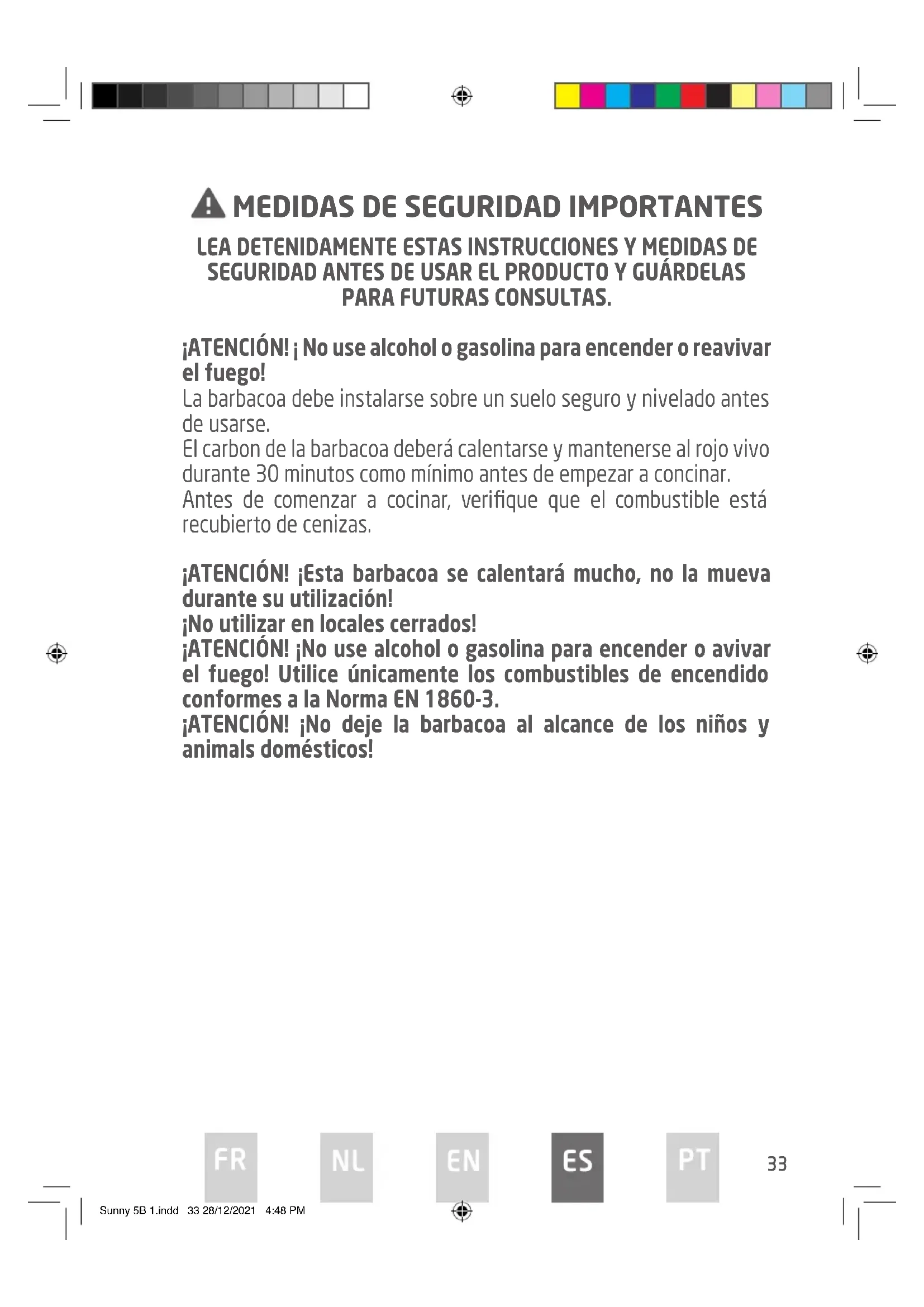 MEDIDAS DE SEGURIDAD IMPORTANTES................................p. 33 COMPONENTES............................................................................p. 36 INSTALACIÓN...............................................................................p. 38 ENCENDIDO DEL COMBUSTIBLE................................................p. 41 Sunny 5B 1.indd 32 28/12/2021 4:48 PM33 LEA DETENIDAMENTE ESTAS INSTRUCCIONES Y MEDIDAS DE SEGURIDAD ANTES DE USAR EL PRODUCTO Y GUÁRDELAS PARA FUTURAS CONSULTAS. ¡ATENCIÓN! ¡ No use alcohol o gasolina para encender o reavivar el fuego! La barbacoa debe instalarse sobre un suelo seguro y nivelado antes de usarse. El carbon de la barbacoa deberá calentarse y mantenerse al rojo vivo durante 30 minutos como mínimo antes de empezar a concinar. Antes de comenzar a cocinar, verique que el combustible está recubierto de cenizas. ¡ATENCIÓN! ¡Esta barbacoa se calentará mucho, no la mueva durante su utilización! ¡No utilizar en locales cerrados! ¡ATENCIÓN! ¡No use alcohol o gasolina para encender o avivar el fuego! Utilice únicamente los combustibles de encendido conformes a la Norma EN 1860-3. ¡ATENCIÓN! ¡No deje la barbacoa al alcance de los niños y animals domésticos!