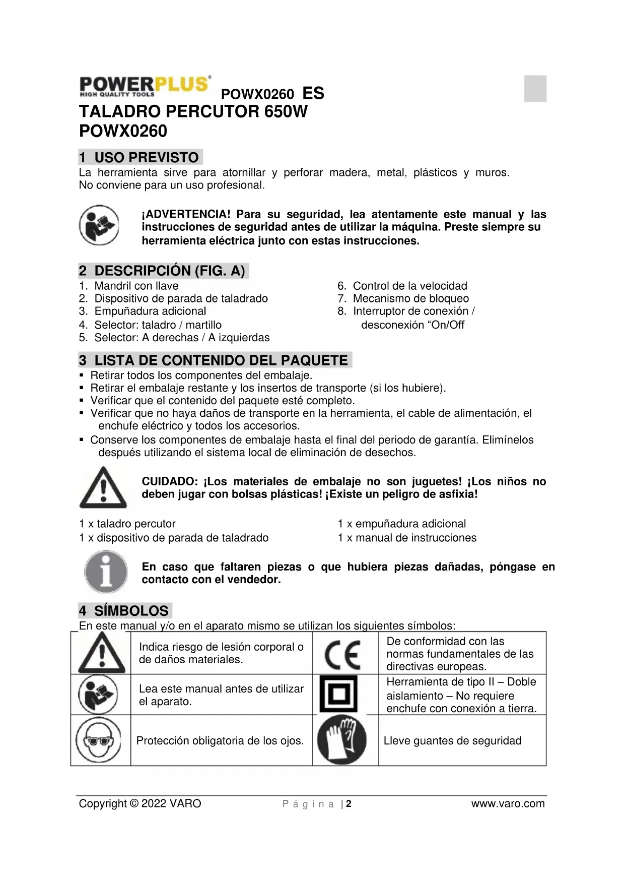 - Cuando se utilice un tambor para cable, habrá que desenrollar el cable totalmente. La sección del conductor será como mínimo de 1,5 mm2.POWX0260 ES Copyright © 2022 VARO P á g i n a | 5 www.varo.com