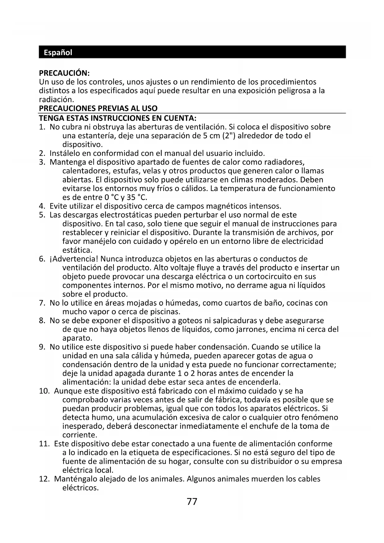 1. No cubra ni obstruya las aberturas de ventilación. Si coloca el dispositivo sobre