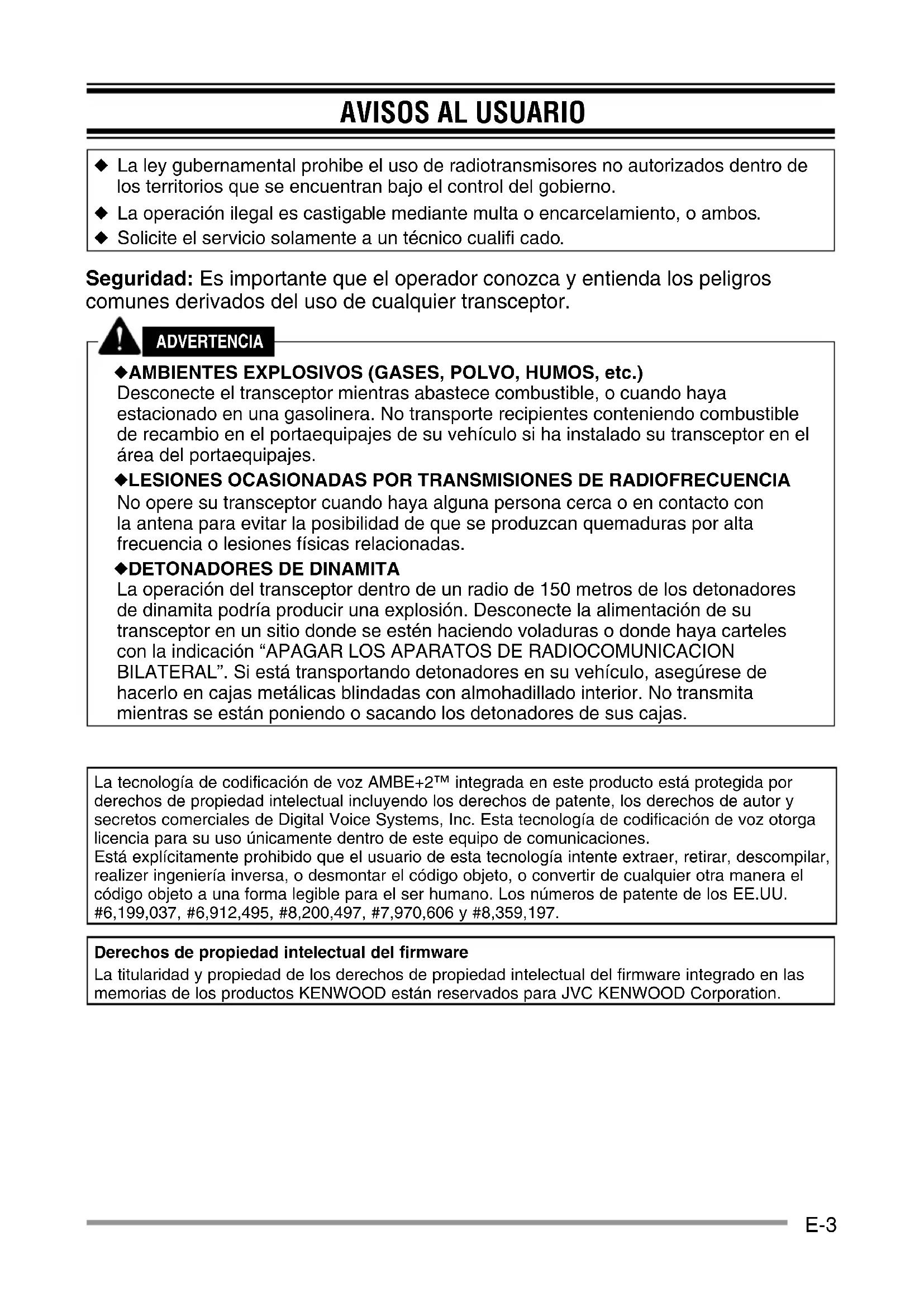 La operación del transceptor dentro de un radio de 150 metros de los detonadores de dinamita podría producir una explosión. Desconecte la alimentación de su transceptor en un sitio donde se estén haciendo voladuras o donde haya carteles con la indicación “APAGAR LOS APARATOS DE RADIOCOMUNICACION BILATERAL”. Si está transportando detonadores en su vehículo, asegúrese de hacerlo en cajas metálicas blindadas con almohadillado interior. No transmita mientras se están poniendo o sacando los detonadores de sus cajas. La tecnología de codificación de voz AMBE+2™ integrada en este producto está protegida por derechos de propiedad intelectual incluyendo los derechos de patente, los derechos de autor y secretos comerciales de Digital Voice Systems, Inc. Esta tecnología de codificación de voz otorga licencia para su uso únicamente dentro de este equipo de comunicaciones. Está explícitamente prohibido que el usuario de esta tecnología intente extraer, retirar, descompilar, realizer ingeniería inversa, o desmontar el código objeto, o convertir de cualquier otra manera el código objeto a una forma legible para el ser humano. Los números de patente de los EE.UU. #6,199,037, #6,912,495, #8,200,497, #7,970,606 y #8,359,197. Derechos de propiedad intelectual del firmware La titularidad y propiedad de los derechos de propiedad intelectual del firmware integrado en las memorias de los productos KENWOOD están reservados para JVC KENWOOD Corporation.E-4 PRECAUCIONES Observe las siguientes precauciones para evitar incendios, lesiones personales y daños al transceptor.