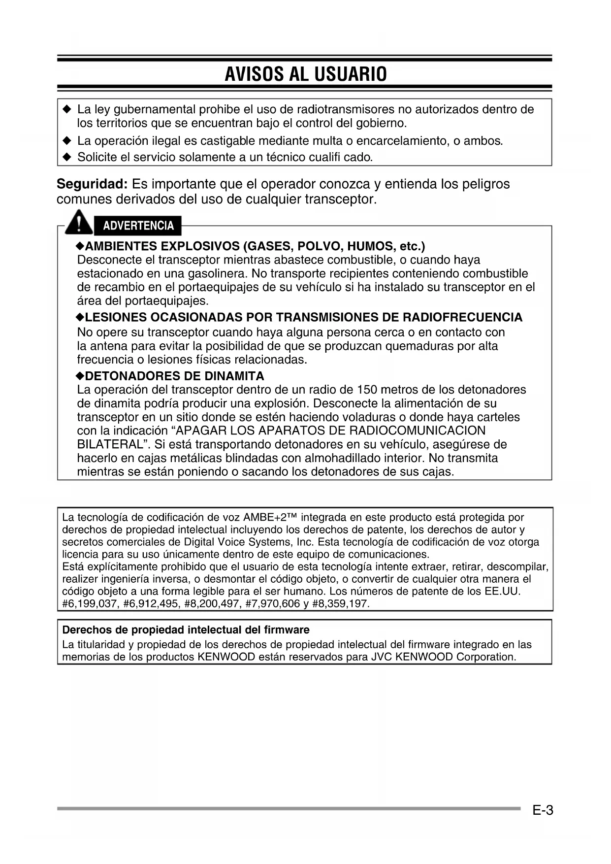 La operación del transceptor dentro de un radio de 150 metros de los detonadores de dinamita podría producir una explosión. Desconecte la alimentación de su transceptor en un sitio donde se estén haciendo voladuras o donde haya carteles con la indicación “APAGAR LOS APARATOS DE RADIOCOMUNICACION BILATERAL”. Si está transportando detonadores en su vehículo, asegúrese de hacerlo en cajas metálicas blindadas con almohadillado interior. No transmita mientras se están poniendo o sacando los detonadores de sus cajas. La tecnología de codificación de voz AMBE+2™ integrada en este producto está protegida por derechos de propiedad intelectual incluyendo los derechos de patente, los derechos de autor y secretos comerciales de Digital Voice Systems, Inc. Esta tecnología de codificación de voz otorga licencia para su uso únicamente dentro de este equipo de comunicaciones. Está explícitamente prohibido que el usuario de esta tecnología intente extraer, retirar, descompilar, realizer ingeniería inversa, o desmontar el código objeto, o convertir de cualquier otra manera el código objeto a una forma legible para el ser humano. Los números de patente de los EE.UU. #6,199,037, #6,912,495, #8,200,497, #7,970,606 y #8,359,197. Derechos de propiedad intelectual del firmware La titularidad y propiedad de los derechos de propiedad intelectual del firmware integrado en las memorias de los productos KENWOOD están reservados para JVC KENWOOD Corporation.E-4 PRECAUCIONES Observe las siguientes precauciones para evitar incendios, lesiones personales y daños al transceptor.