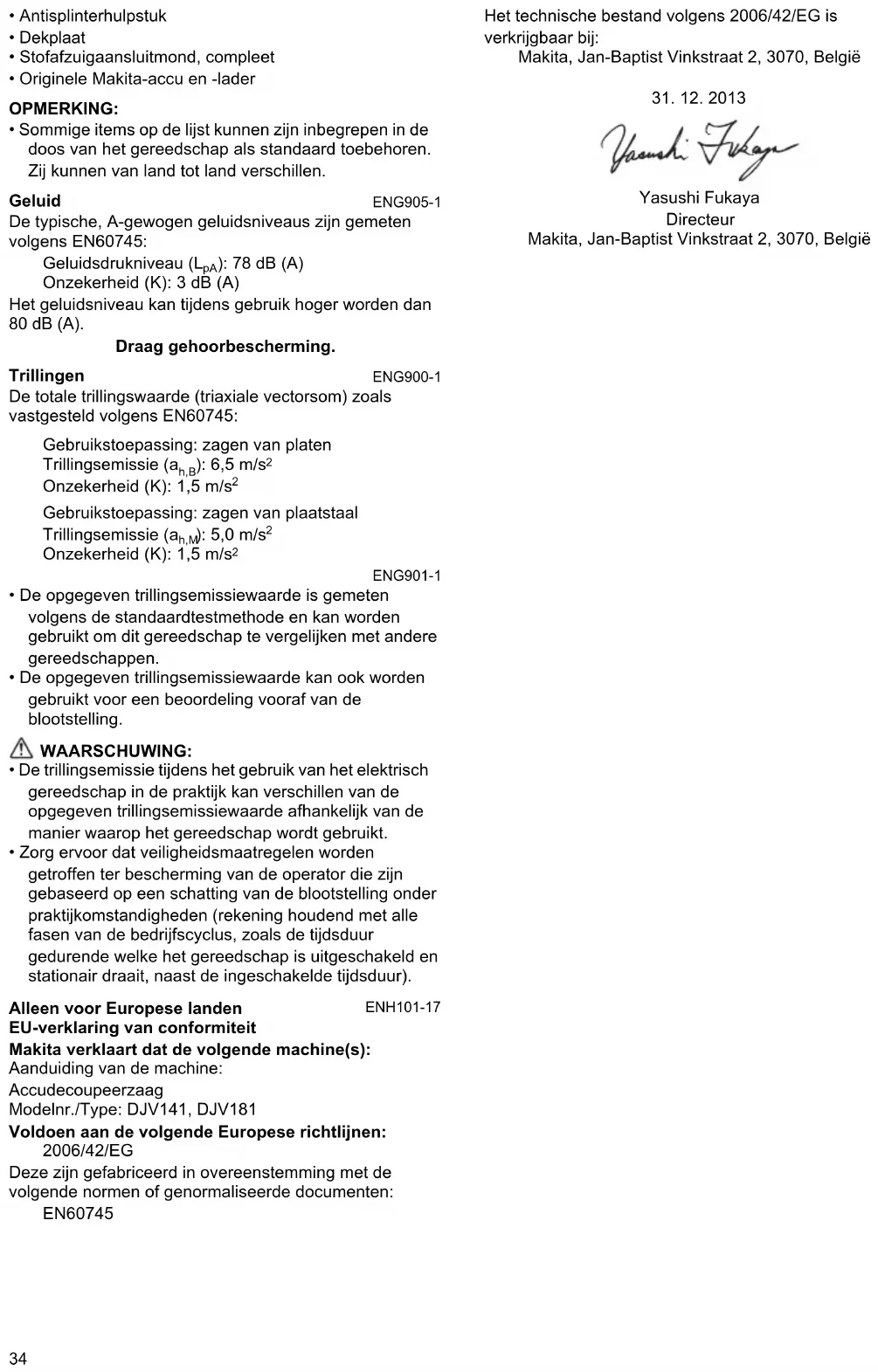 - Asegúrese de identificar las mediciones correctas para proteger al operario, que se basan en una estimación de la exposición en condiciones de uso reales (teniendo en cuenta todas las partes del ciclo de operaciones, como los momentos en los que la herramienta está apagada y cuando funciona al ralentí además del tiempo en que está activado el interruptor). Solo para países europeos ENH101-17 Declaración de conformidad de la CE Makita declara que las siguientes máquinas: Designación de la máquina: Sierra Caladora Inalámbrica Nº de modelo/Tipo: DJV141, DJV181 Cumplen con las siguientes Directivas europeas: 2006/42/CE Se han fabricado de acuerdo con los siguientes estándares o documentos estandarizados: EN60745 El archivo técnico de acuerdo con 2006/42/CE está disponible en: Makita, Jan-Baptist Vinkstraat 2, 3070, Bélgica