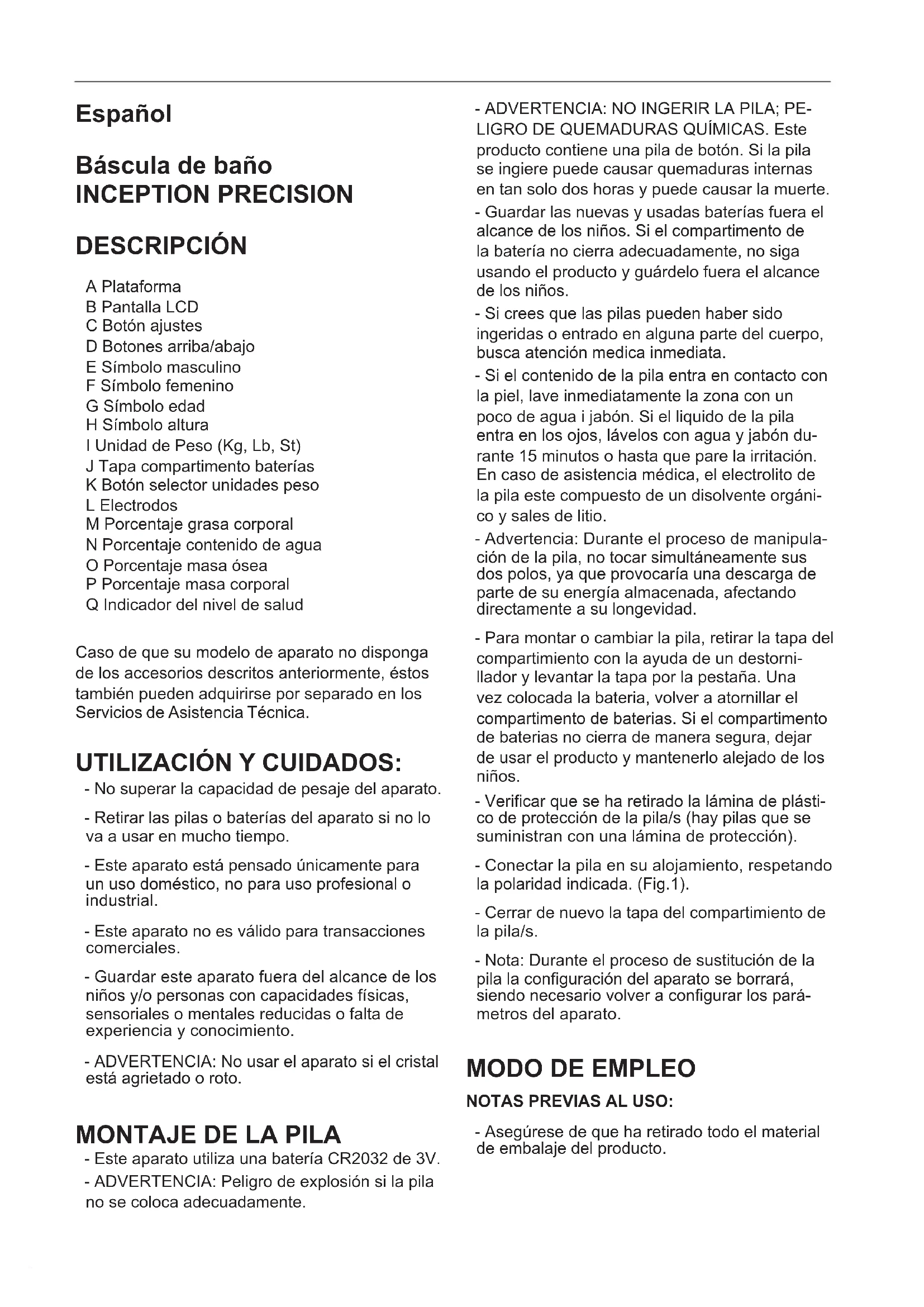 QEspañol Báscula de baño INCEPTION PRECISION DESCRIPCIÓN A Plataforma B Pantalla LCD C Botón ajustes D Botones arriba/abajo E Símbolo masculino F Símbolo femenino G Símbolo edad H Símbolo altura I Unidad de Peso (Kg, Lb, St) J Tapa compartimento baterías K Botón selector unidades peso L Electrodos M Porcentaje grasa corporal N Porcentaje contenido de agua O Porcentaje masa ósea P Porcentaje masa corporal Q Indicador del nivel de salud Caso de que su modelo de aparato no disponga de los accesorios descritos anteriormente, éstos también pueden adquirirse por separado en los Servicios de Asistencia Técnica. UTILIZACIÓN Y CUIDADOS: - No superar la capacidad de pesaje del aparato. - Retirar las pilas o baterías del aparato si no lo va a usar en mucho tiempo. - Este aparato está pensado únicamente para un uso doméstico, no para uso profesional o industrial. - Este aparato no es válido para transacciones comerciales. - Guardar este aparato fuera del alcance de los niños y/o personas con capacidades físicas, sensoriales o mentales reducidas o falta de experiencia y conocimiento. - ADVERTENCIA: No usar el aparato si el cristal está agrietado o roto.