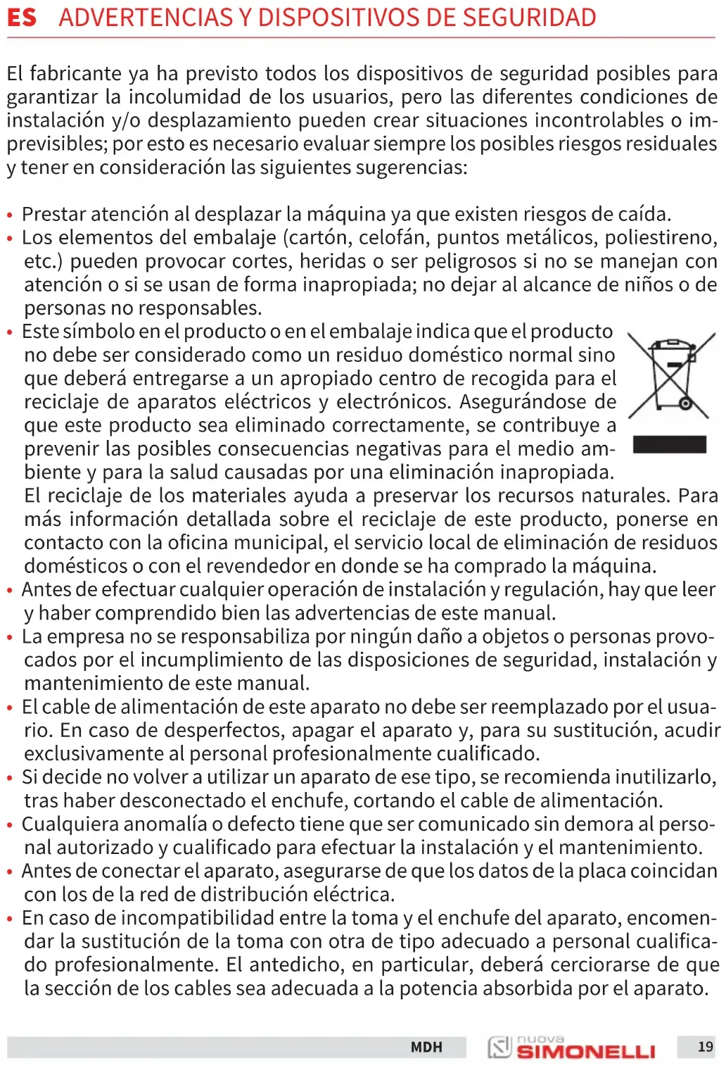 - En caso de que un cuerpo extraño bloquee el motor, apagar inmediatamente la máquina y ponerse en contacto con un centro de asistencia autorizado. ATENCIÓN La etiqueta “MOTOR PROTEGIDO POR TÉRMICO” indica que la máquina está equipada con protección térmica del motor. Si dicho dispositivo se dispara, no intentar efectuar ninguna maniobra sino que hay que desconectar la máquina de la red de alimentación y asegurarse, antes de volver a poner en marcha la máquina, de que todas las anomalías se hayan resuelto.22 MDH El manual está destinado al usuario y/o al encargado de mantenimiento de la máquina y se forma parte de esta. El presente manual tiene la función de facilitar toda la información para un uso correcto de la máquina y un adecuado mantenimiento, así como para tutelar la seguridad del operador. El manual debe ser conservado por toda la vida de la máquina y debe cederse a cualquier otro usuario o siguiente propietario. Las indicaciones que figuran en este manual no reemplazan las disposiciones de seguridad y los datos técnicos para la instalación y el funcionamiento colocados en la máquina y en los embalajes. El presente manual refleja el estado de la técnica en el momento actual y no podrá considerarse inadecuado solo porque se actualice sucesivamente a raíz de nuevas experiencias. El fabricante se reserva el derecho a modificar el manual sin tener la obligación de actualizar las ediciones precedentes, excepto que en casos excepcionales. Un uso inapropiado de la máquina o disconforme con lo indicado en el presente manual anula toda garantía o responsabilidad del fabricante; el uso está reser- vado a una persona adulta y responsable. Es necesario conservar con cuidado el presente manual ya que el fabricante no responde por daños causados a cosas y personas, o sufridos por la máquina si se utiliza de manera diferente a lo indicado en el manual y si no se respetan las disposiciones de mantenimiento y seguridad.