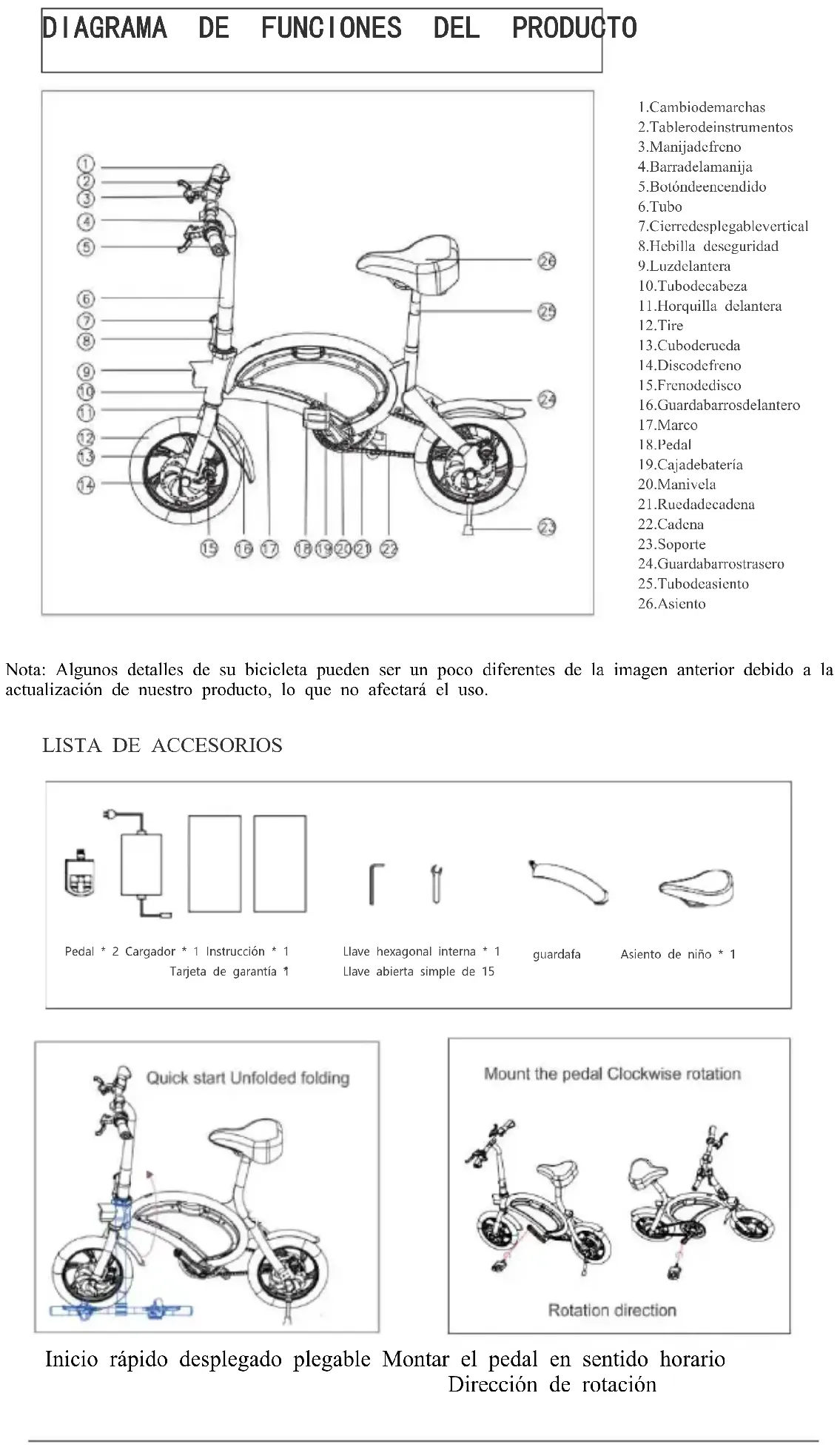 1.Cambiodemarchas 2.Tablerodeinstrumentos 3.Manijadefreno 4.Barradelamanija 5.Botóndeencendido 6.Tubo 7.Cierredesplegablevertical 8.Hebilla deseguridad 9.Luzdelantera 10.Tubodecabeza 11.Horquilla delantera 12.Tire 13.Cuboderueda 14.Discodefreno 15.Frenodedisco 16.Guardabarrosdelantero 17.Marco 18.Pedal 19.Cajadebatería 20.Manivela 21.Ruedadecadena 22.Cadena 23.Soporte 24.Guardabarrostrasero 25.Tubodeasiento 26.Asiento Nota: Algunos detalles de su bicicleta pueden ser un poco diferentes de la imagen anterior debido a la actualización de nuestro producto, lo que no afectará el uso.
