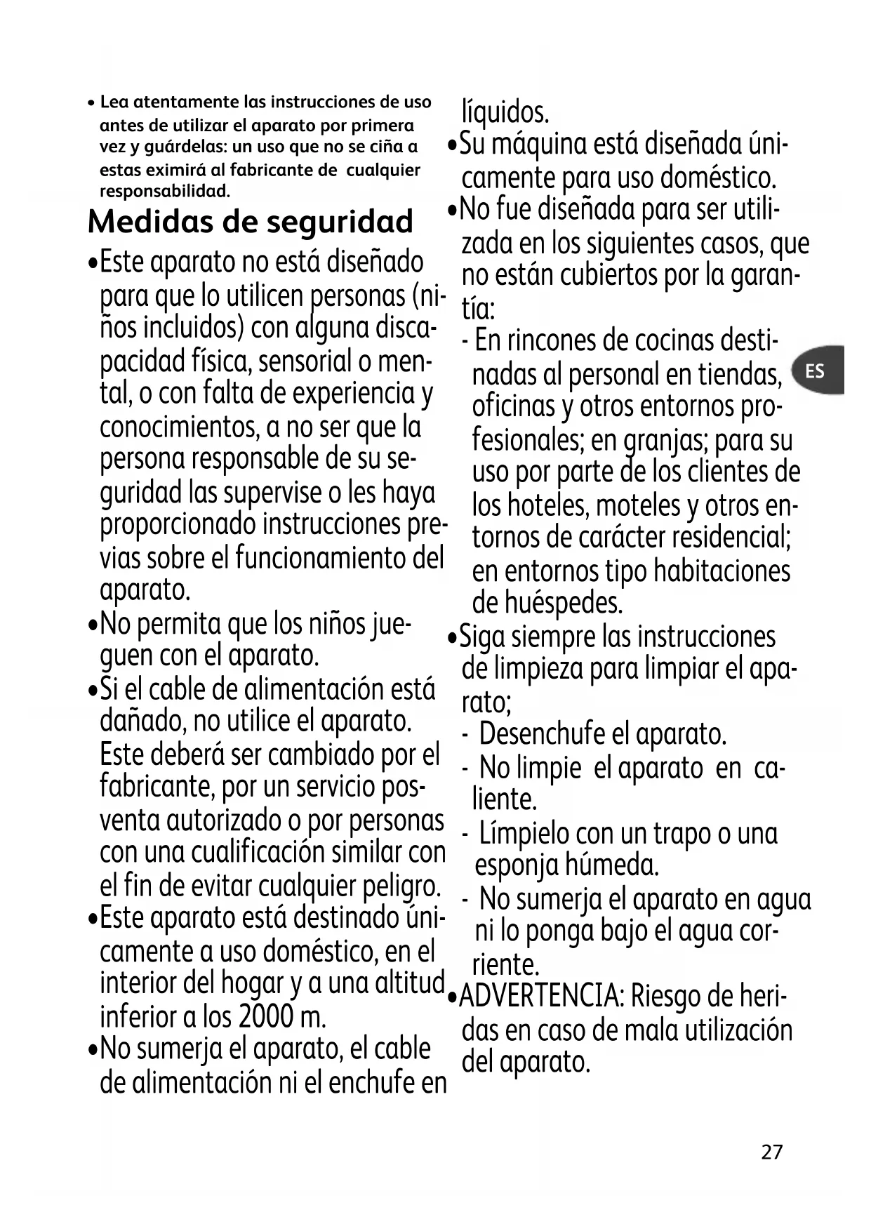 - Lea atentamente las instrucciones de uso antes de utilizar el aparato por primera vez y guárdelas: un uso que no se ciña a estas eximirá al fabricante de cualquier responsabilidad. Medidas de seguridad