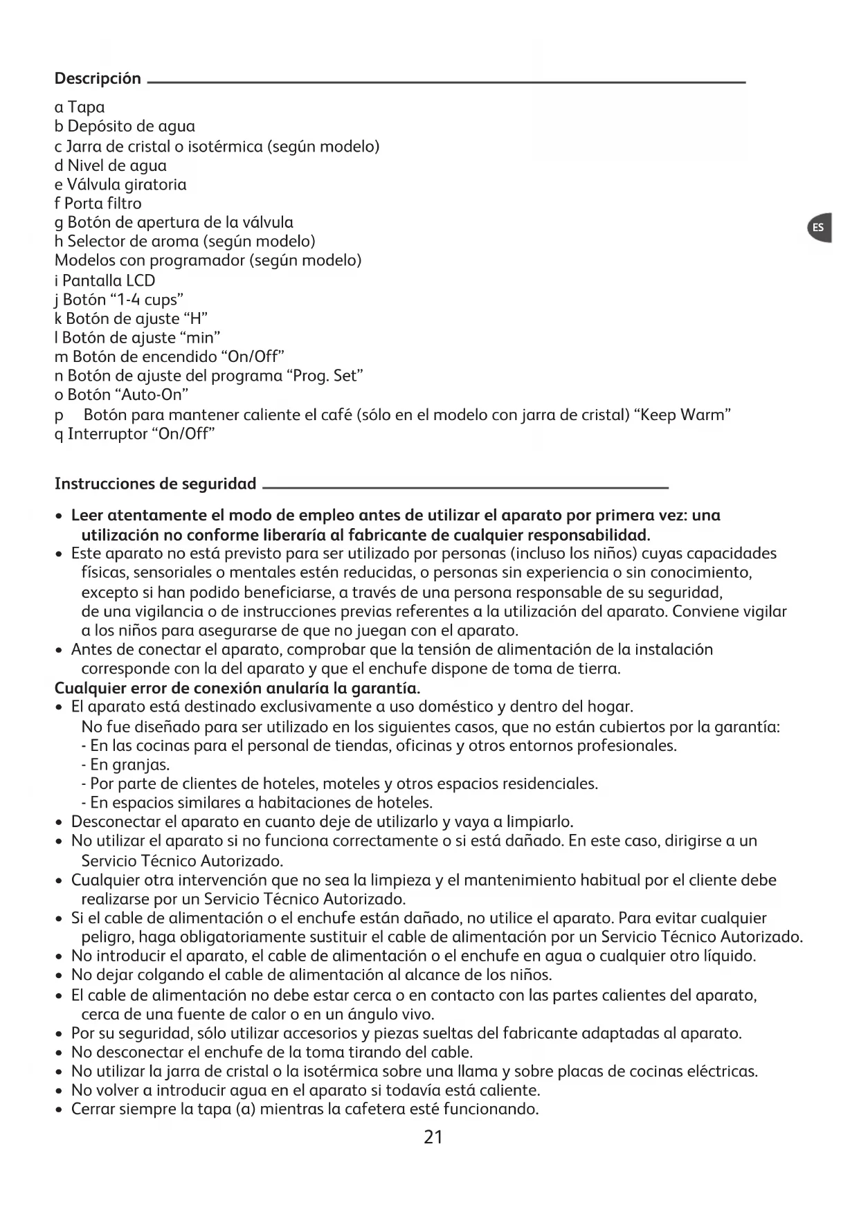 - Aclarar la cafetera poniéndola a funcionar 2 o 3 veces con 1 litro de agua. La garantía excluye las cafeteras que funcionan mal o no funcionan por no desincrustarlas. Accesorios - Jarra isotérmica - Jarra de cristal En caso de problemas - Comprobar: