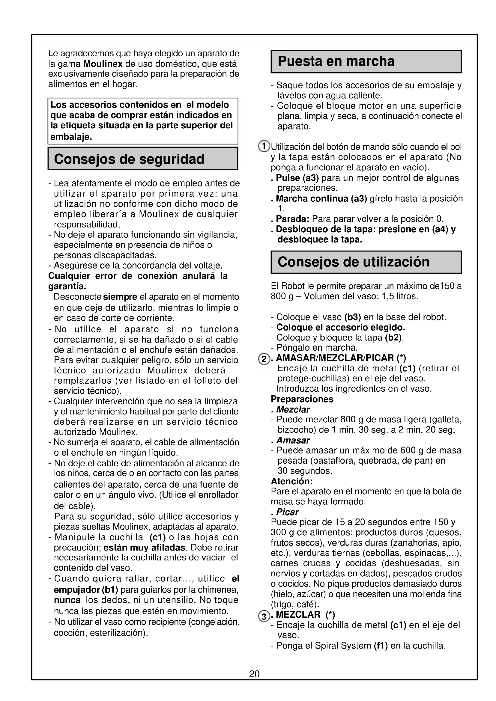 . Parada: Para parar volver a la posición 0. . Desbloqueo de la tapa: presione en (a4) y desbloquee la tapa. Consejos de utilización El Robot le permite preparar un máximo de150 a 800 g – Volumen del vaso: 1,5 litros. - Coloque el vaso (b3) en la base del robot. - Coloque el accesorio elegido. - Coloque y bloquee la tapa (b2). - Póngalo en marcha. . AMASAR/MEZCLAR/PICAR (*) - Encaje la cuchilla de metal (c1) (retirar el protege-cuchillas) en el eje del vaso. - Introduzca los ingredientes en el vaso. Preparaciones . Mezclar - Puede mezclar 800 g de masa ligera (galleta, bizcocho) de 1 min. 30 seg. a 2 min. 20 seg. . Amasar - Puede amasar un máximo de 600 g de masa pesada (pastaflora, quebrada, de pan) en 30 segundos. Atención: Pare el aparato en el momento en que la bola de masa se haya formado. . Picar Puede picar de 15 a 20 segundos entre 150 y 300 g de alimentos: productos duros (quesos, frutos secos), verduras duras (zanahorias, apio, etc.), verduras tiernas (cebollas, espinacas,...), carnes crudas y cocidas (deshuesadas, sin nervios y cortadas en dados), pescados crudos o cocidos. No pique productos demasiado duros (hielo, azúcar) o que necesiten una molienda fina (trigo, café). . MEZCLAR (*) - Encaje la cuchilla de metal (c1) en el eje del vaso. - Ponga el Spiral System (f1) en la cuchilla.