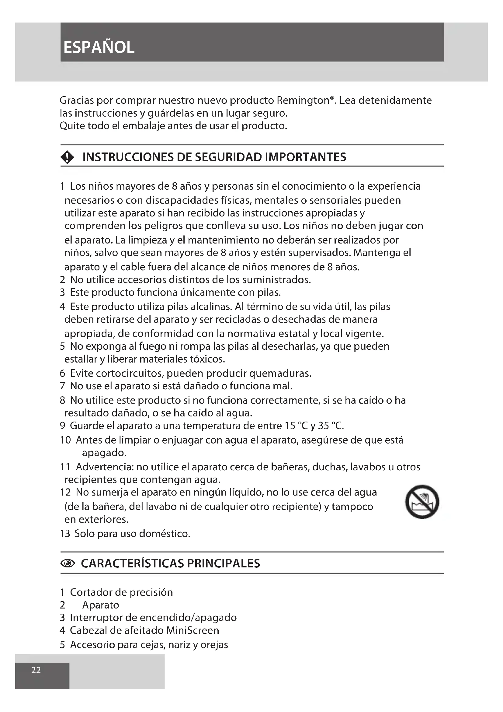1 Los niños mayores de 8 años y personas sin el conocimiento o la experiencia necesarios o con discapacidades físicas, mentales o sensoriales pueden utilizar este aparato si han recibido las instrucciones apropiadas y comprenden los peligros que conlleva su uso. Los niños no deben jugar con el aparato. La limpieza y el mantenimiento no deberán ser realizados por niños, salvo que sean mayores de 8 años y estén supervisados. Mantenga el aparato y el cable fuera del alcance de niños menores de 8 años. 2 No utilice accesorios distintos de los suministrados. 3 Este producto funciona únicamente con pilas. 4 Este producto utiliza pilas alcalinas. Al término de su vida útil, las pilas deben retirarse del aparato y ser recicladas o desechadas de manera apropiada, de conformidad con la normativa estatal y local vigente. 5 No exponga al fuego ni rompa las pilas al desecharlas, ya que pueden estallar y liberar materiales tóxicos. 6 Evite cortocircuitos, pueden producir quemaduras. 7 No use el aparato si está dañado o funciona mal. 8 No utilice este producto si no funciona correctamente, si se ha caído o ha resultado dañado, o se ha caído al agua. 9 Guarde el aparato a una temperatura de entre 15 °C y 35 °C. 10 Antes de limpiar o enjuagar con agua el aparato, asegúrese de que está apagado. 11 Advertencia: no utilice el aparato cerca de bañeras, duchas, lavabos u otros recipientes que contengan agua. 12 No sumerja el aparato en ningún líquido, no lo use cerca del agua (de la bañera, del lavabo ni de cualquier otro recipiente) y tampoco en exteriores. 13 Solo para uso doméstico.