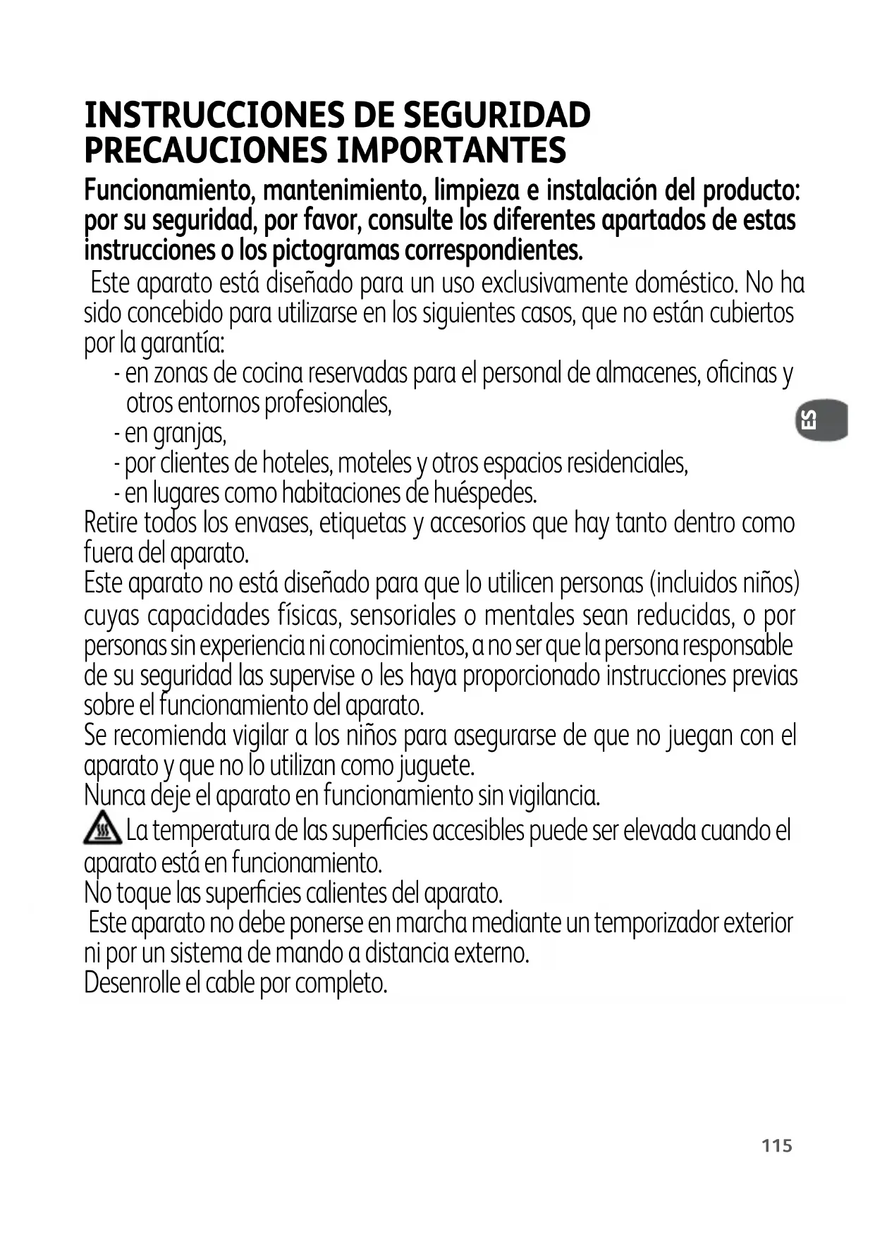 PRECAUCIONES IMPORTANTES Funcionamiento, mantenimiento, limpieza e instalación del producto: por su seguridad, por favor, consulte los diferentes apartados de estas instrucciones o los pictogramas correspondientes. Este aparato está diseñado para un uso exclusivamente doméstico. No ha sido concebido para utilizarse en los siguientes casos, que no están cubiertos por la garantía: - en zonas de cocina reservadas para el personal de almacenes, oficinas y otros entornos profesionales, - en granjas, - por clientes de hoteles, moteles y otros espacios residenciales, - en lugares como habitaciones de huéspedes. Retire todos los envases, etiquetas y accesorios que hay tanto dentro como fuera del aparato. Este aparato no está diseñado para que lo utilicen personas (incluidos niños) cuyas capacidades físicas, sensoriales o mentales sean reducidas, o por personas sin experiencia ni conocimientos, a no ser que la persona responsable de su seguridad las supervise o les haya proporcionado instrucciones previas sobre el funcionamiento del aparato. Se recomienda vigilar a los niños para asegurarse de que no juegan con el aparato y que no lo utilizan como juguete. Nunca deje el aparato en funcionamiento sin vigilancia. La temperatura de las superficies accesibles puede ser elevada cuando el aparato está en funcionamiento. No toque las superficies calientes del aparato. Este aparato no debe ponerse en marcha mediante un temporizador exterior ni por un sistema de mando a distancia externo. Desenrolle el cable por completo. ES116 Si el cable de alimentación está dañado debe ser reemplazado por el fabricante, su servicio de posventa o por personal cualificado para evitar cualquier peligro. Si se utiliza un alargador eléctrico, debe tener una sección equivalente y llevar toma de tierra incorporada. Adoptar todas las precauciones necesarias para que nadie tropiece con el alargador. Conecte el aparato únicamente a un enchufe con toma de tierra incorporada. Compruebe que la instalación eléctrica es compatible con la potencia y la tensión indicadas debajo del aparato. No sumerja este aparato. Nunca sumerja el aparato ni el cable en agua. Este aparato puede ser utilizado por niños de 8 años o más y personas con capacidades físicas, sensoriales o mentales reducidas o personas sin experiencia ni conocimientos, siempre que hayan recibido instrucciones o supervisión sobre el uso seguro del aparato y conozcan los riesgos a los que se exponen. La limpieza y el mantenimiento que ha de realizar el usuario no deben ser efectuados por niños, salvo que tengan más de 8 años y estén vigilados. Mantenga el aparato y el cable de alimentación fuera del alcance de los niños menores de 8 años. ATENCIÓN : no calentar ni precalentar el grill sin las 2 placas interiores. Qué debe hacer