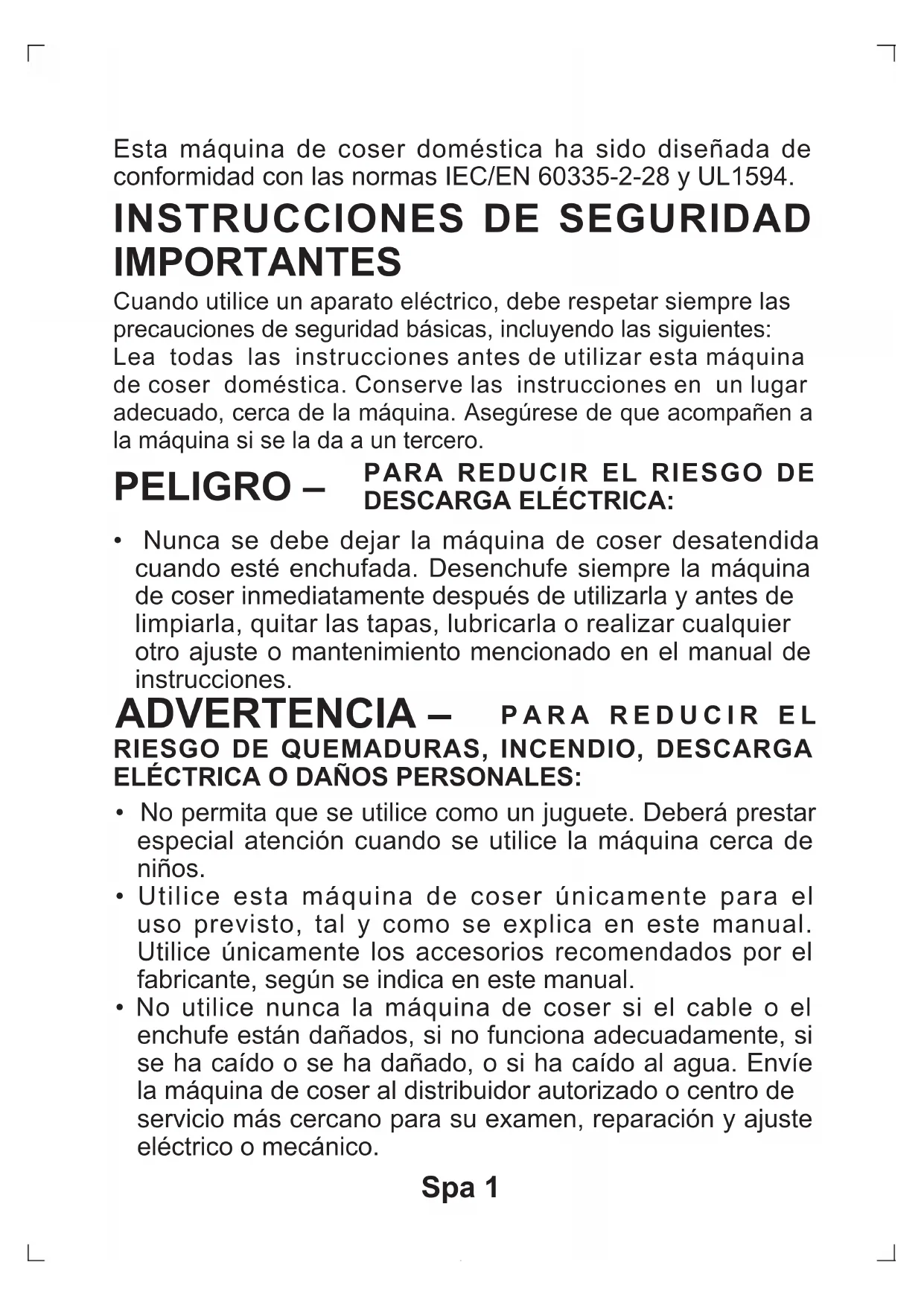 - Esta máquina de coser está provista de un doble aislamiento. Use exclusivamente piezas de repuesto idénticas. Consulte las instrucciones sobre el mantenimiento de los aparatos provistos de doble aislamiento.Spa 4