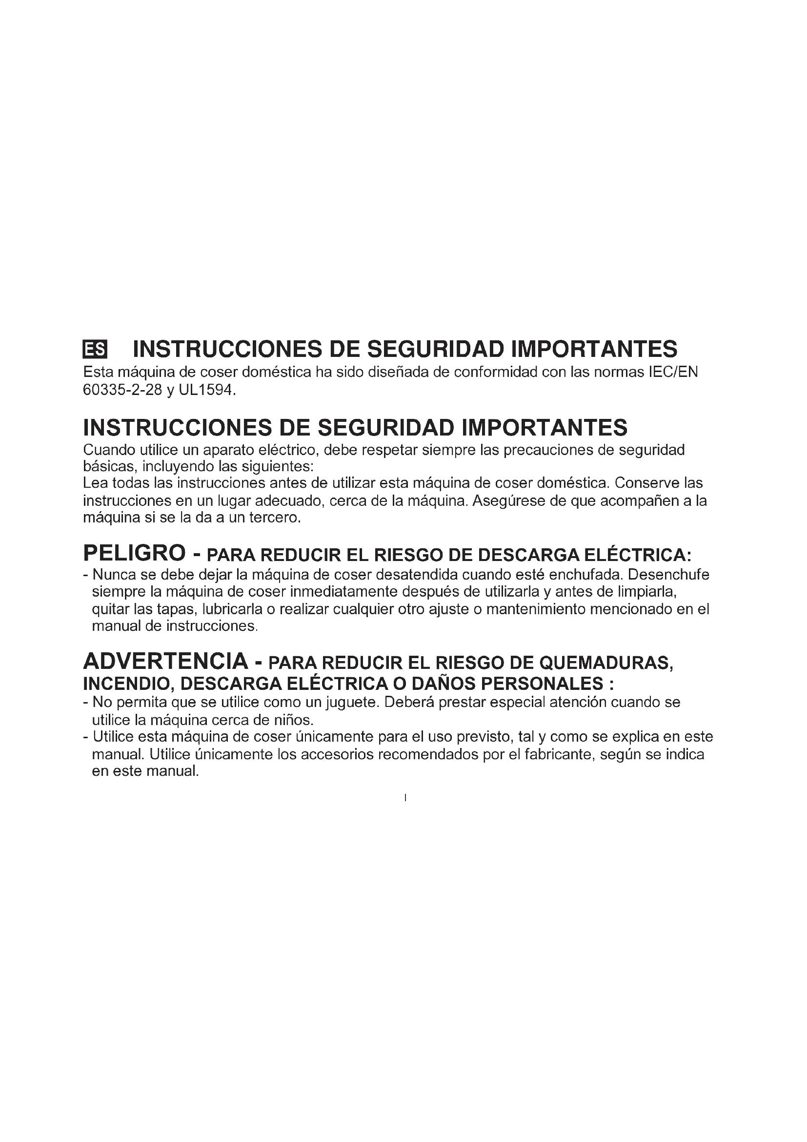 PELIGRO - Cuando utilice un aparato eléctrico, debe respetar siempre las precauciones de seguridad básicas, incluyendo las siguientes: Lea todas las instrucciones antes de utilizar esta máquina de coser doméstica. Conserve las instrucciones en un lugar adecuado, cerca de la máquina. Asegúrese de que acompañen a la máquina si se la da a un tercero. - Nunca se debe dejar la máquina de coser desatendida cuando esté enchufada. Desenchufe siempre la máquina de coser inmediatamente después de utilizarla y antes de limpiarla, quitar las tapas, lubricarla o realizar cualquier otro ajuste o mantenimiento mencionado en el manual de instrucciones. PARA REDUCIR EL RIESGO DE DESCARGA ELÉCTRICA: