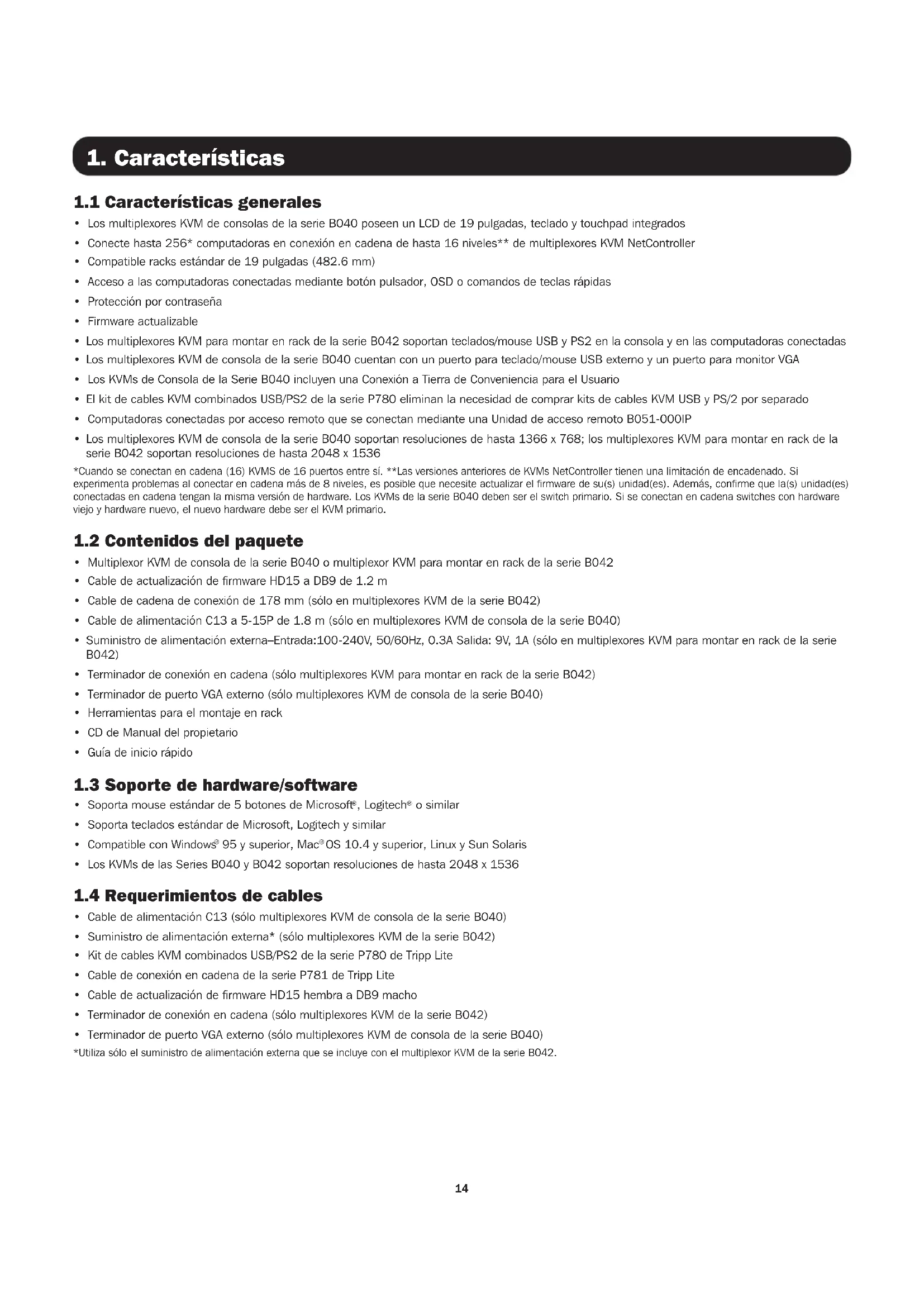 - Los multiplexores KVM de consola de la serie B040 soportan resoluciones de hasta 1366 x 768; los multiplexores KVM para montar en rack de la serie B042 soportan resoluciones de hasta 2048 x 1536 *Cuando se conectan en cadena (16) KVMS de 16 puertos entre sí. **Las versiones anteriores de KVMs NetController tienen una limitación de encadenado. Si experimenta problemas al conectar en cadena más de 8 niveles, es posible que necesite actualizar el firmware de su(s) unidad(es). Además, confirme que la(s) unidad(es) conectadas en cadena tengan la misma versión de hardware. Los KVMs de la serie B040 deben ser el switch primario. Si se conectan en cadena switches con hardware viejo y hardware nuevo, el nuevo hardware debe ser el KVM primario.