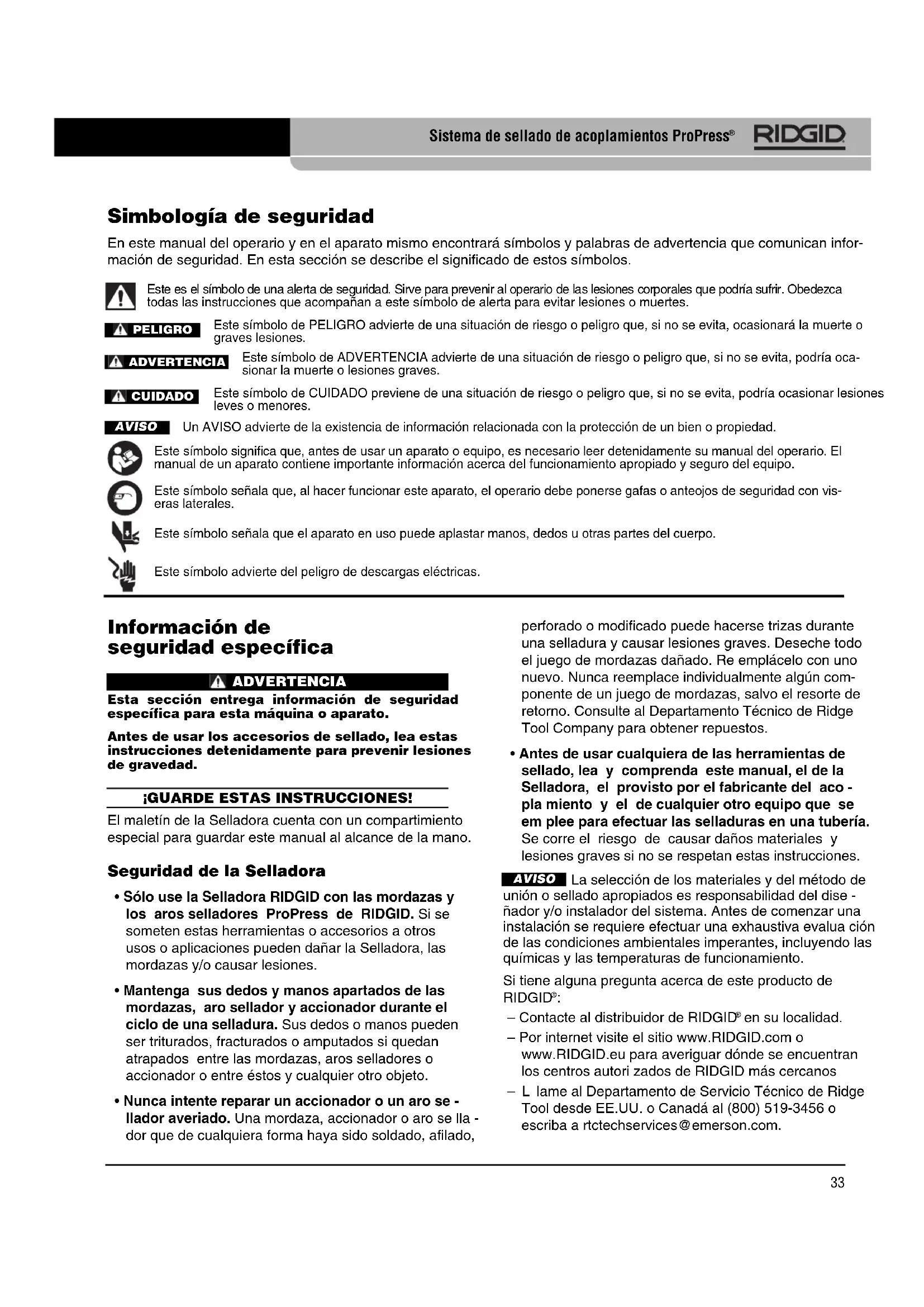 - Antes de usar cualquiera de las herramientas de sellado, lea y comprenda este manual, el de la Selladora, el provisto por el fabricante del aco - pla miento y el de cualquier otro equipo que se em plee para efectuar las selladuras en una tubería. Se corre el riesgo de causar daños materiales y lesiones graves si no se respetan estas instrucciones. La selección de los materiales y del método de unión o sellado apropiados es responsabilidad del dise - ñador y/o instalador del sistema. Antes de comenzar una instalación se requiere efectuar una exhaustiva evalua ción de las condiciones ambientales imperantes, incluyendo las químicas y las temperaturas de funcionamiento. Si tiene alguna pregunta acerca de este producto de RIDGID