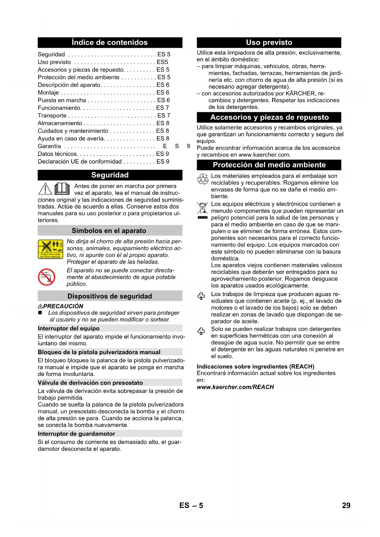 95 dB(A) Uitzondering volgens verordening (EU) 2019/1781 bij- lage I punt 2 (12): j) Technische wijzigingen voorbehouden. EU-conformiteitsverklaring Product: Hogedrukreiniger Type: 1.950-xxx Van toepassing zijnde EU-richtlijnen 2014/30/EU 2006/42/EG (+2009/127/EG) 2011/65/EU 2000/14/EG 2009/125/EG Toegepaste verordeningen (EU) 2019/1781 Toegepaste geharmoniseerde normen EN 60335–1 EN 60335–2–79 EN 62233: 2008 EN 55014–1: 2017 EN 55014–2: 2015 EN 61000–3–2: 2014 EN 61000–3–3: 2013 EN IEC 63000: 2018 Toegepaste conformiteitsbeoordelingsprocedure 2000/14/EG: Bijlage V Geluidsvermogensniveau dB(A) Gemeten: 92 Gegarandeerd: 95 Winnenden, 2021/06/01 Chairman of the Board of Management Director Regulatory Affairs & Certification 28 NL– 5 Antes de poner en marcha por primera vez el aparato, lea el manual de instruc- ciones original y las indicaciones de seguridad suminis- tradas. Actúe de acuerdo a ellas. Conserve estos dos manuales para su uso posterior o para propietarios ul- teriores. 몇 PRECAUCIÓN Los dispositivos de seguridad sirven para proteger al usuario y no se pueden modificar o sortear. El interruptor del aparato impide el funcionamiento invo- luntario del mismo. El bloqueo bloquea la palanca de la pistola pulverizado- ra manual e impide que el aparato se ponga en marcha de forma involuntaria. La válvula de derivación evita sobrepasar la presión de trabajo permitida. Cuando se suelta la palanca de la pistola pulverizadora manual, un presostato desconecta la bomba y el chorro de alta presión se para. Cuando se acciona la palanca, se conecta la bomba nuevamente. Si el consumo de corriente es demasiado alto, el guar- damotor desconecta el aparato. Utilice esta limpiadora de alta presión, exclusivamente, en el ámbito doméstico: – para limpiar máquinas, vehículos, obras, herra- mientas, fachadas, terrazas, herramientas de jardi- nería etc. con chorro de agua de alta presión (si es necesario agregar detergente). – con accesorios autorizados por KÄRCHER, re- cambios y detergentes. Respetar las indicaciones de los detergentes. Utilice solamente accesorios y recambios originales, ya que garantizan un funcionamiento correcto y seguro del equipo. Puede encontrar información acerca de los accesorios y recambios en www.kaercher.com. Indicaciones sobre ingredientes (REACH) Encontrará información actual sobre los ingredientes en: www.kaercher.com/REACH Índice de contenidos Seguridad . . . . . . . . . . . . . . . . . . . . . . . . . . . ES 5 Uso previsto . . . . . . . . . . . . . . . . . . . . . . . . . ES5 Accesorios y piezas de repuesto. . . . . . . . . . ES 5 Protección del medio ambiente . . . . . . . . . . . ES 5 Descripción del aparato. . . . . . . . . . . . . . . . . ES 6 Montaje . . . . . . . . . . . . . . . . . . . . . . . . . . . . . ES 6 Puesta en marcha . . . . . . . . . . . . . . . . . . . . . ES 6 Funcionamiento. . . . . . . . . . . . . . . . . . . . . . . ES 7 Transporte . . . . . . . . . . . . . . . . . . . . . . . . . . . ES 7 Almacenamiento . . . . . . . . . . . . . . . . . . . . . . ES 8 Cuidados y mantenimiento . . . . . . . . . . . . . . ES 8 Ayuda en caso de avería. . . . . . . . . . . . . . . . ES 8 Garantía . . . . . . . . . . . . . . . . . . . . . . . . . . . .ES9 Datos técnicos. . . . . . . . . . . . . . . . . . . . . . . . ES 9 Declaración UE de conformidad . . . . . . . . . . ES 9 Seguridad Símbolos en el aparato No dirija el chorro de alta presión hacia per- sonas, animales, equipamiento eléctrico ac- tivo, ni apunte con él al propio aparato. Proteger el aparato de las heladas. El aparato no se puede conectar directa- mente al abastecimiento de agua potable público. Dispositivos de seguridad Interruptor del equipo Bloqueo de la pistola pulverizadora manual Válvula de derivación con presostato Interruptor de guardamotor Uso previsto Accesorios y piezas de repuesto Protección del medio ambiente Los materiales empleados para el embalaje son reciclables y recuperables. Rogamos elimine los envases de forma que no se dañe el medio am- biente. Los equipos eléctricos y electrónicos contienen a menudo componentes que pueden representar un peligro potencial para la salud de las personas y para el medio ambiente en caso de que se mani- pulen o se eliminen de forma errónea. Estos com- ponentes son necesarios para el correcto funcio- namiento del equipo. Los equipos marcados con este símbolo no pueden eliminarse con la basura doméstica. Los aparatos viejos contienen materiales valiosos reciclables que deberán ser entregados para su aprovechamiento posterior. Rogamos desguace los aparatos usados ecológicamente. Los trabajos de limpieza que producen aguas re- siduales que contienen aceite (p. ej., el lavado de motores o el lavado de los bajos) solo se deben realizar en zonas de lavado que dispongan de se- parador de aceite. Solo se pueden realizar trabajos con detergentes en superficies herméticas con una conexión al desagüe de agua sucia. No permitir que se entre el detergente en las aguas naturales ni penetre en el suelo. 29ES– 6 El contenido de suministro de su aparato (dependiendo del modelo) está ilustrado en el embalaje. Este manual de instrucciones describe todas las opciones posibles. Ilustraciones, véase la página 2 1 Conexión de agua con filtro incorporado 2 Pieza de acoplamiento para la conexión de agua 3 Acoplamiento rápido para manguera de alta pre- sión 4 Conexión de alta presión 5 Interruptor del aparato „0/OFF“ / „I/ON“ 6 Depósito de detergente 7 Zona de recogida para pistola pulverizadora ma- nual 8 Manguera de aspiración para detergente 9 Mango para el transporte 10 Zona de recogida para la lanza dosificadora 11 Cable de conexión a red y enchufe de red 12 Rueda de transporte 13 Pistola pulverizadora manual 14 Bloqueo de la pistola pulverizadora manual 15 Tecla para separar la manguera de alta presión de la pistola pulverizadora manual 16 Manguera de alta presión 17 Lanza dosific