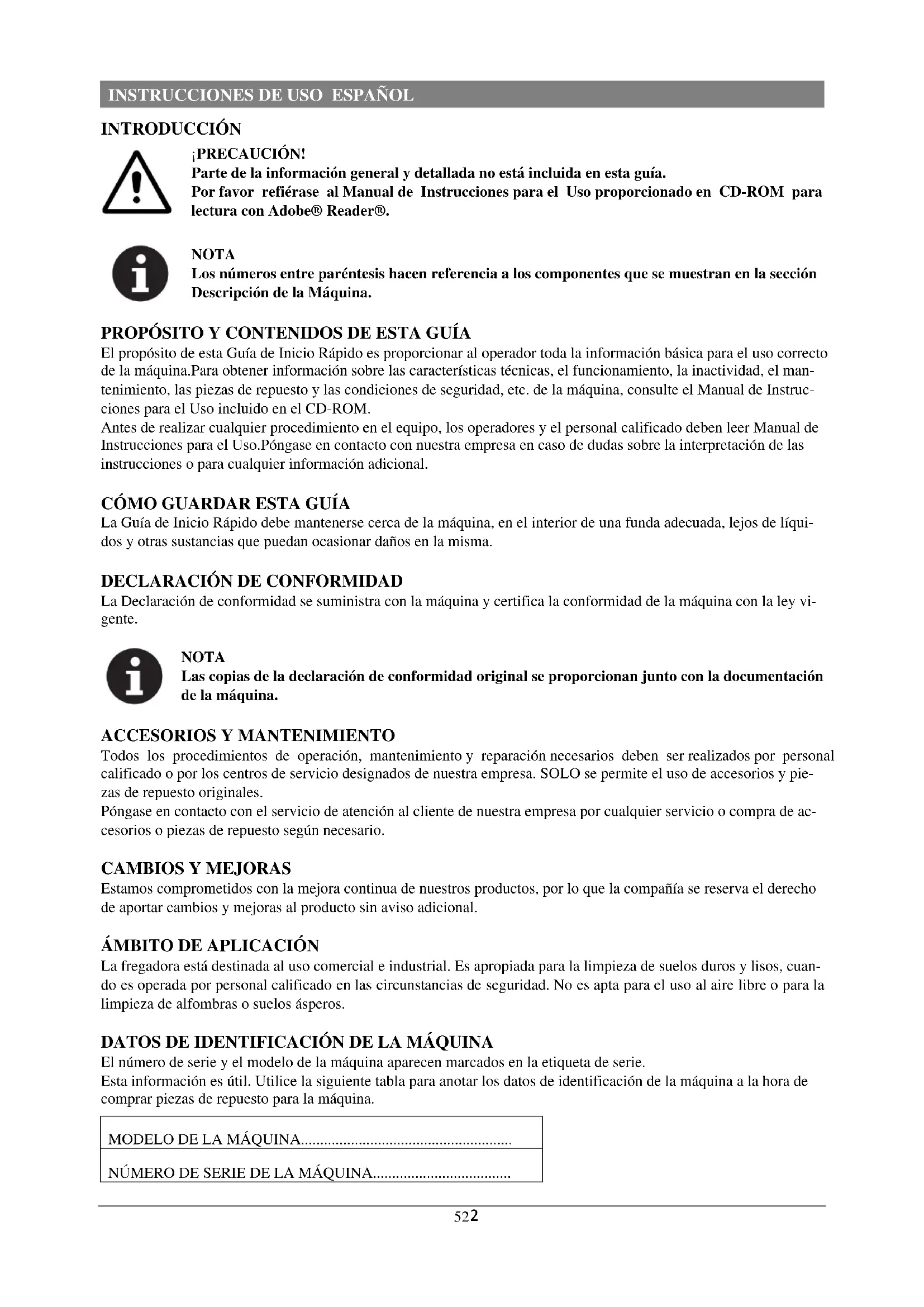 La fregadora está destinada al uso comercial e industrial. Es apropiada para la limpieza de suelos duros y lisos, cuan- do es operada por personal calificado en las circunstancias de seguridad. No es apta para el uso al aire libre o para la limpieza de alfombras o suelos ásperos. DATOS DE IDENTIFICACIÓN DE LA MÁQUINA El número de serie y el modelo de la máquina aparecen marcados en la etiqueta de serie. Esta información es útil. Utilice la siguiente tabla para anotar los datos de identificación de la máquina a la hora de comprar piezas de repuesto para la máquina.