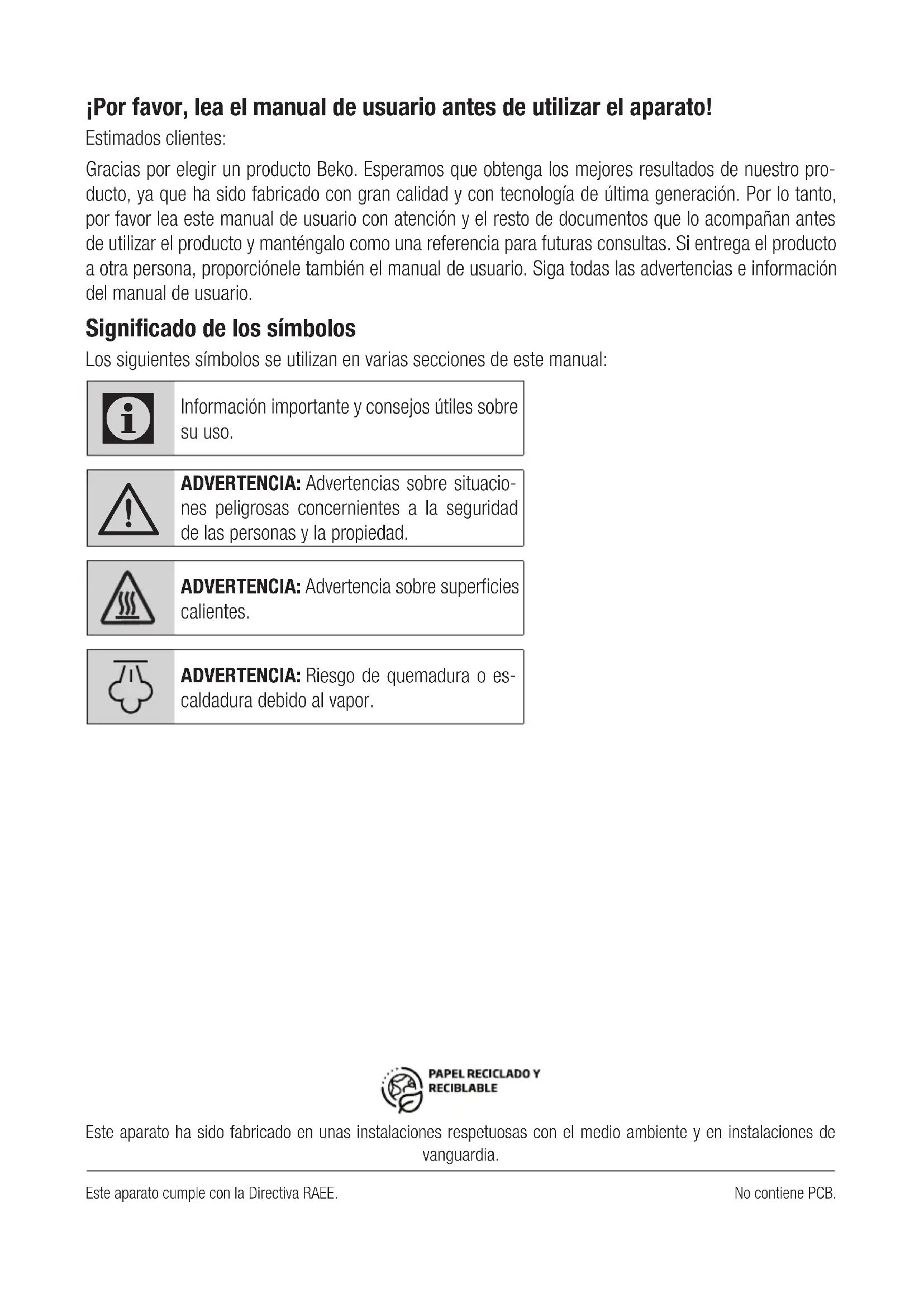 ADVERTENCIA: Advertencias sobre situacio- nes peligrosas concernientes a la seguridad de las personas y la propiedad. ADVERTENCIA: Advertencia sobre superficies calientes. ADVERTENCIA: Riesgo de quemadura o es- caldadura debido al vapor. Este aparato cumple con la Directiva RAEE. Este aparato ha sido fabricado en unas instalaciones respetuosas con el medio ambiente y en instalaciones de vanguardia. No contiene PCB.30 / ES Plancha de vapor / Manual de usuario Control y piezas