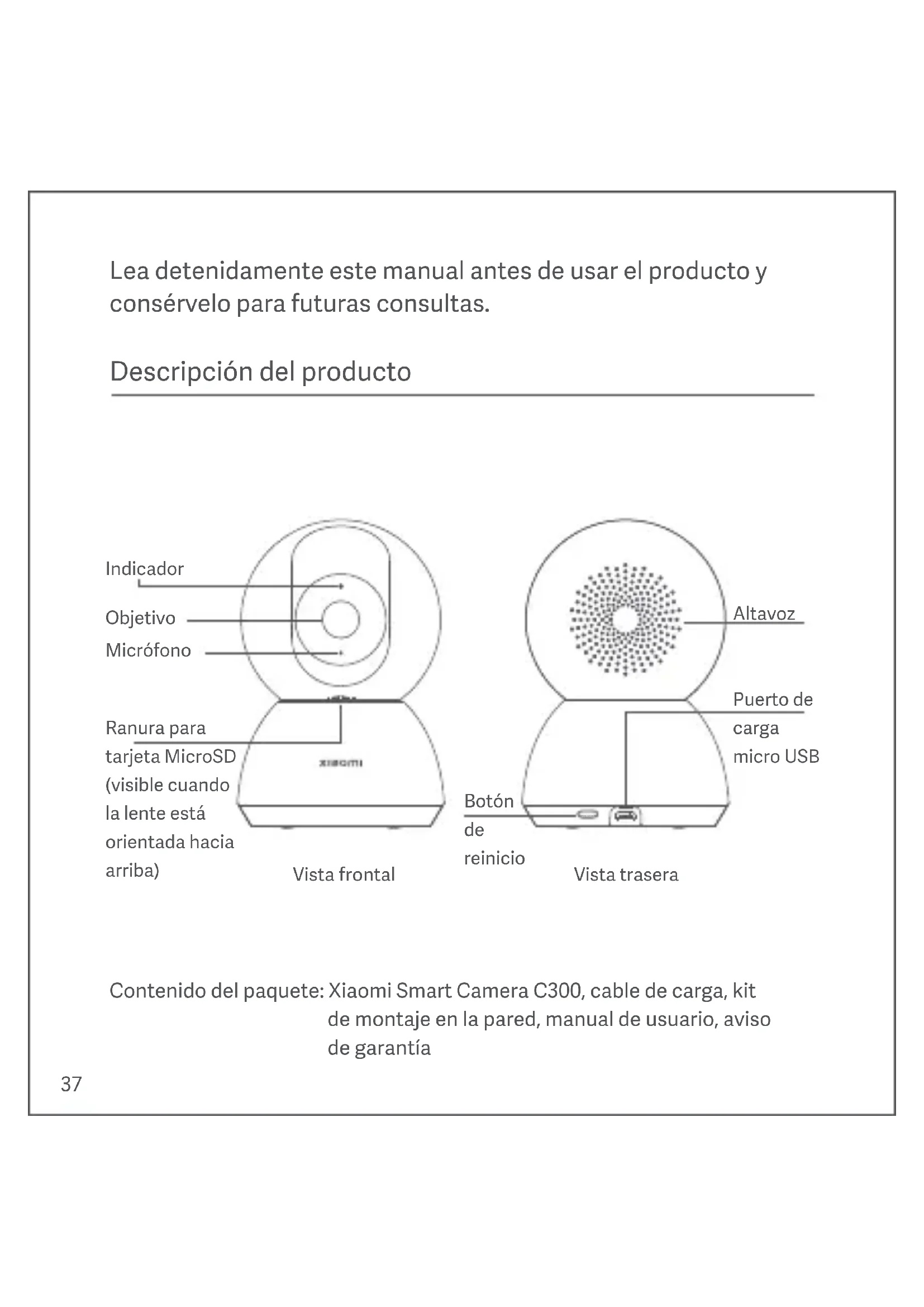 reinicio Vista frontal Vista trasera Contenido del paquete: Xiaomi Smart Camera C300, cable de carga, kit de montaje en la pared, manual de usuario, aviso de garantía