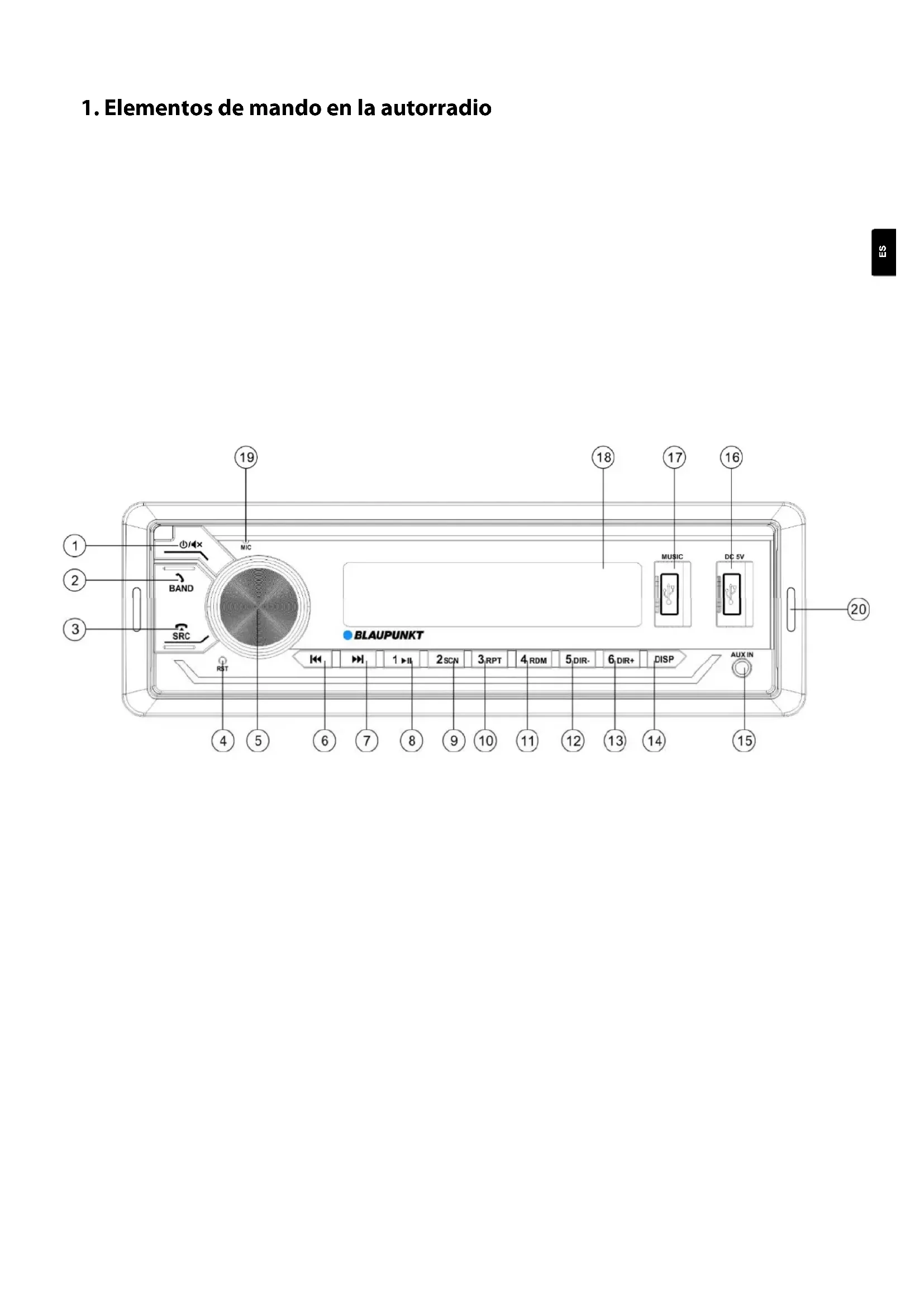 Pulsación corta: Enciende la autorradio, silencia la autorradio Pulsación larga: Apaga la autorradio ② BAND / Recepción de una llamada Cambio del nivel de memoria, recepción de una llamada entrante, marcación del último número ③ Botón SRC / rechazar llamada, terminación de llamada: Selecciona la fuente de audio, las fuentes de audio disponibles se conmutan una por una. Durante la llamada: Rechaza una llamada, finaliza una llamada ④ Botón RST: Reinicio: Restablecimiento del equipo ⑤ Perilla: Rotación: Volumen alto / silencioso En el menú, cambia entre opciones de ajuste / cambia opciones Pulsación corta: Llamada a los ajustes de audio (ver AJUSTES | MENÚ) Pulsación larga: Activación de los ajustes avanzados (véase AJUSTES | MENÚ) ⑥ ⑦Botones de avance / retroceso: Pulsación corta: Según la fuente, búsqueda de FM, cambio de servicio DAB (solo BPA 1124 DAB BT), cambio de pista USB / Bluetooth, etc. Pulsación larga: Según la fuente: FM: Búsqueda manual DAB: Búsqueda de banda (solo BPA 1124 DAB BT) USB: Avance / retroceso rápido ⑧-⑬Botones de emisoras de radio: Pulsación corta: Llama a una emisora o a una segunda función especial / función visualizada en función de la fuente seleccionada (reproducción / pausa, función de reproducción SCN, función de repetición RPT, reproducción aleatoria RDM) Pulsación larga: Almacenamiento de la emisora de radio actual ⑫-⑬ Botones DIR-/ DIR+: Pulsación corta: Cambia de directorio durante la reproducción por USB Pulsación larga: 10 títulos hacia atrás / delante para reproducción desde USB ⑭ Botón DISP: Pulsación corta: Cambia entre diferentes informaciones en la pantalla en función de la fuente seleccionada Pulsación larga: Ajuste de hora ⑮ Entrada AUX-IN: Conector para fuente de audio analógica externa con clavija estéreo de 3,5 mm ⑯ Conector USB DC 5V: Conector para cargar dispositivos como teléfonos móviles (máx. 2A) ⑰ Conector USB MUSIC: Interfaz para memorias USB de reproducción de música (FAT / exFAT) ⑱ Pantalla LC: Muestra información como la emisora, la pista, la hora y las opciones de configuración ⑲ MIC Micrófono: (micrófono manos libres) ⑳ Orificios para la herramienta de desmontajeES