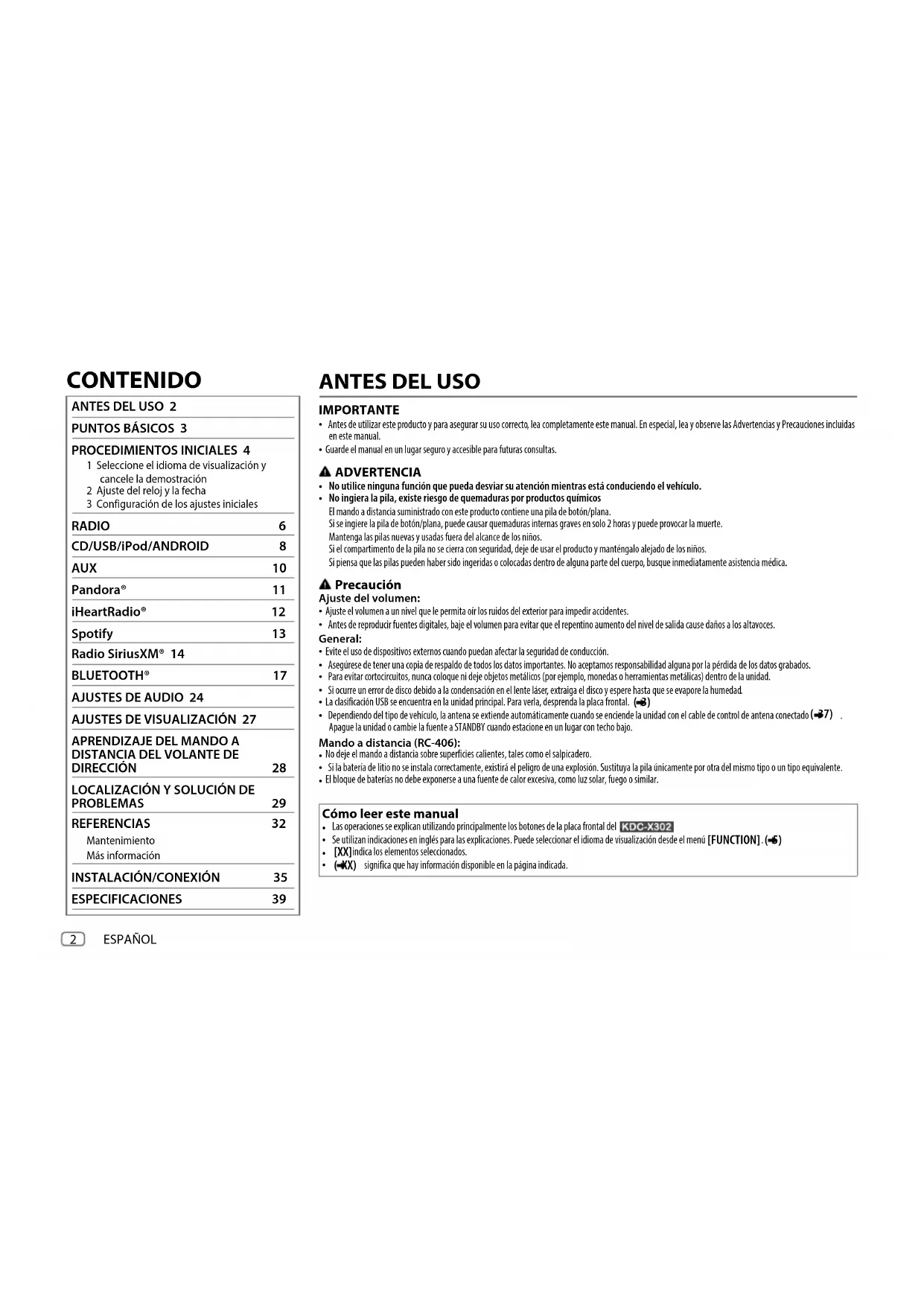 PROCEDIMIENTOS INICIALES 4 1 Seleccione el idioma de visualización y cancele la demostración 2 Ajuste del reloj y la fecha 3 Configuración de los ajustes iniciales RADIO 6 CD/USB/iPod/ANDROID 8 AUX 10 Pandora® 11 iHeartRadio® 12 Spotify 13 Radio SiriusXM® 14 BLUETOOTH® 17
