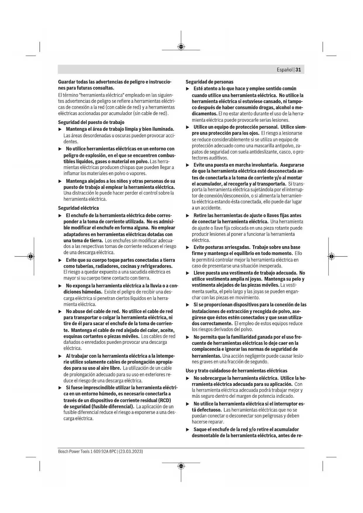 El nivel de vibraciones y el valor de emisiones de ruidos indi- cados en estas instrucciones han sido determinados según un procedimiento de medición normalizado y pueden servir como base de comparación con otras herramientas eléctri- cas. También son adecuados para estimar provisionalmente la emisión de vibraciones y ruidos. El nivel de vibraciones y el valor de emisiones de ruidos indi- cados han sido determinados para las aplicaciones principa- les de la herramienta eléctrica. Por ello, el nivel de vibracio- nes y el valor de emisiones de ruidos pueden ser diferentes si la herramienta eléctrica se utiliza para otras aplicaciones, con útiles diferentes, o si el mantenimiento de la misma fue- se deficiente. Ello puede suponer un aumento drástico de la emisión de vibraciones y de ruidos durante el tiempo total de trabajo. Para determinar con exactitud las emisiones de vibraciones y de ruidos, es necesario considerar también aquellos tiem- pos en los que el aparato esté desconectado, o bien, esté en funcionamiento, pero sin ser utilizado realmente. Ello puede suponer una disminución drástica de las emisiones de vibra- ciones y de ruidos durante el tiempo total de trabajo. Fije unas medidas de seguridad adicionales para proteger al usuario de los efectos por vibraciones, como por ejemplo: Mantenimiento de la herramienta eléctrica y de los útiles, conservar calientes las manos, organización de las secuen- cias de trabajo. Acumulador Bosch también vende herramientas eléctricas accionadas por acumulador sin acumulador. En el embalaje puede ver si un acumulador está incluido en el volumen de suministro de su herramienta eléctrica. Carga del acumulador u Utilice únicamente los cargadores que se enumeran en los datos técnicos. Solamente estos cargadores han sido especialmente adaptados a los acumuladores de io- nes de litio empleados en su herramienta eléctrica. Indicación: Los acumuladores de iones de litio se entregan parcialmente cargados debido a la normativa de transporte internacional. Con el fin de obtener la plena potencia del acumulador, cargue completamente el acumulador antes de su primer uso. Montaje del acumulador Desplace el acumulador cargado en el alojamiento del acu- mulador, hasta que encastre perceptible. Desmontaje del acumulador Para la extracción del acumulador, presione la tecla de de- senclavamiento y retire el acumulador. No proceda con brusquedad. Indicador del estado de carga del acumulador Diodo luminoso (LED) Capacidad Luz permanente 3×verde 75–100% Luz permanente 2×verde 40–75% Luz permanente 1×verde 15–40% Luz intermitente lenta 1×verde 0–15% Los 3LEDs del indicador de estado del acumulador parpade- an rápidamente, si la temperatura del acumulador está fuera del margen de temperatura de servicio y/o ha reaccionado la protección contra sobrecarga. Indicaciones para el trato óptimo del acumulador Proteja el acumulador de la humedad y del agua. Únicamente almacene el acumulador en el margen de tem- peratura desde −20°C hasta 50°C. P.ej., no deje el acumu- lador en el coche en verano. Si después de una recarga, el tiempo de funcionamiento del acumulador fuese muy reducido, ello es señal de que éste está agotado y deberá sustituirse. Observe las indicaciones referentes a la eliminación. Bosch Power Tools 1 609 92A 8PC | (23.03.2023)36 | Español Montaje u Solamente use hojas de sierra cuyas revoluciones má- ximas admisibles sean superiores a las revoluciones en vacío de la herramienta eléctrica. Aspiración de polvo/virutas (verfiguraB) El polvo de ciertos materiales como, pinturas que contengan plomo, ciertos tipos de madera y algunos minerales y meta- les, puede ser nocivo para la salud. El contacto y la inspira- ción de estos polvos pueden provocar en el usuario o en las personas circundantes reacciones alérgicas y/o enfermeda- des respiratorias. Ciertos polvos como los de roble, encina y haya son conside- rados como cancerígenos, especialmente en combinación con los aditivos para el tratamiento de la madera (cromatos, conservantes de la madera). Los materiales que contengan amianto solamente deberán ser procesados por especialis- tas. – A ser posible utilice un equipo para aspiración de polvo apropiado para el material a trabajar. – Observe que esté bien ventilado el puesto de trabajo. – Se recomienda una mascarilla protectora con un filtro de la clase P2. Observe las prescripciones vigentes en su país sobre los ma- teriales a trabajar. u Evite acumulaciones de polvo en el puesto de trabajo. Los materiales en polvo se pueden inflamar fácilmente. Indicación: Al aserrar, utilice siempre el tubo deflector(21), para evitar sufrir impactos por las virutas que salen despedidas. El deflector (21) se puede utilizar sin sistema de aspiración para polvo/virutas acoplado. Dependiendo de la aplicación, gire el deflector para que las virutas no le golpeen e introdúz- calo firmemente en el expulsor de virutas (16). Aspiración externa (vea la figura B) Inserte un tubo de aspiración (20) (accesorio) sobre el ex- pulsor de virutas (16). Conecte el tubo de aspiración (20) a una aspiradora (accesorio). Encontrará un resumen de las conexiones a distintas aspiradoras al final de estas instruc- ciones. El aspirador debe ser adecuado para el material con el que se va a trabajar. Para aspirar polvo especialmente nocivo para la salud, can- cerígeno, o polvo seco utilice un aspirador especial. Montaje y cambio de la hoja de sierra u Desmonte el acumulador antes de manipular la herra- mienta eléctrica (p. ej. en el mantenimiento, cambio de útil, etc.) así como al transportarla y guardarla. En caso contrario podría accidentarse al accionar fortuita- mente el interruptor de conexión/desconexión. u Al montar la hoja de sierra utilice unos guantes de pro- tección. Podría accidentarse en caso de tocar la hoja de sierra. u Jamás utilice discos amoladores como útil. u Únicamente use hojas de sierra con los d