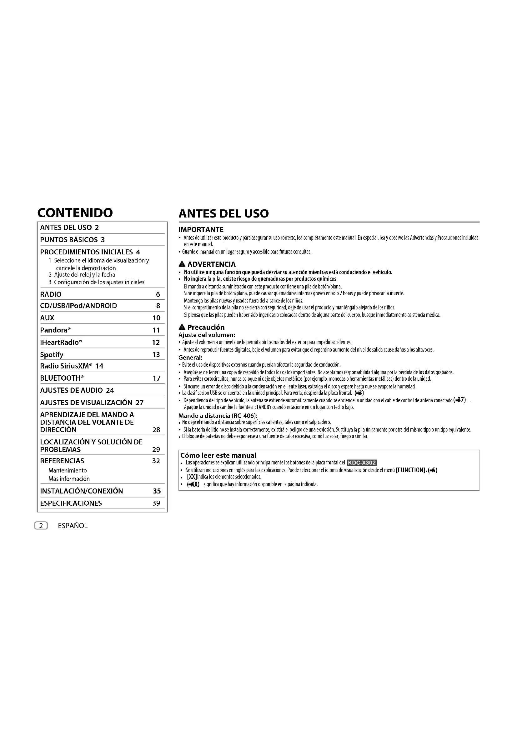 PROCEDIMIENTOS INICIALES 4 1 Seleccione el idioma de visualización y cancele la demostración 2 Ajuste del reloj y la fecha 3 Configuración de los ajustes iniciales RADIO 6 CD/USB/iPod/ANDROID 8 AUX 10 Pandora® 11 iHeartRadio® 12 Spotify 13 Radio SiriusXM® 14 BLUETOOTH® 17