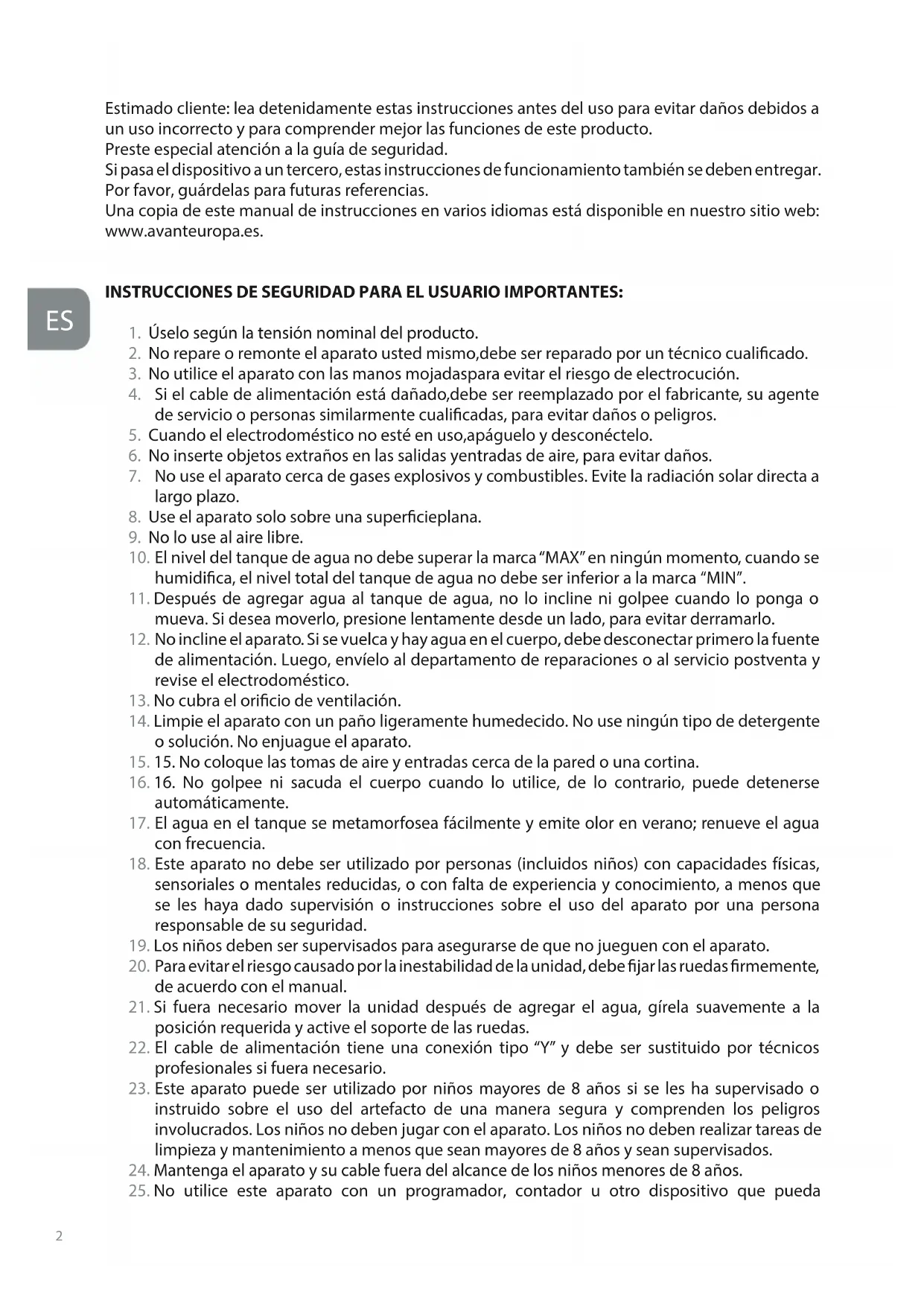 Estimado cliente: lea detenidamente estas instrucciones antes del uso para evitar daños debidos a un uso incorrecto y para comprender mejor las funciones de este producto. Preste especial atención a la guía de seguridad. Si pasa el dispositivo a un tercero, estas instrucciones de funcionamiento también se deben entregar. Por favor, guárdelas para futuras referencias. Una copia de este manual de instrucciones en varios idiomas está disponible en nuestro sitio web: www.avanteuropa.es. INSTRUCCIONES DE SEGURIDAD PARA EL USUARIO IMPORTANTES: