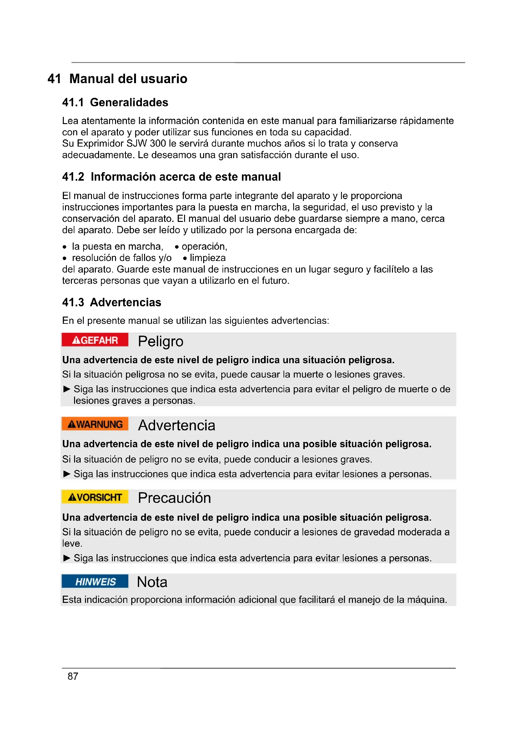 En el presente manual se utilizan las siguientes advertencias: Peligro Una advertencia de este nivel de peligro indica una situación peligrosa. Si la situación peligrosa no se evita, puede causar la muerte o lesiones graves. ► Siga las instrucciones que indica esta advertencia para evitar el peligro de muerte o de lesiones graves a personas. Advertencia Una advertencia de este nivel de peligro indica una posible situación peligrosa. Si la situación de peligro no se evita, puede conducir a lesiones graves. ► Siga las instrucciones que indica esta advertencia para evitar lesiones a personas. Precaución Una advertencia de este nivel de peligro indica una posible situación peligrosa. Si la situación de peligro no se evita, puede conducir a lesiones de gravedad moderada a leve. ► Siga las instrucciones que indica esta advertencia para evitar lesiones a personas. Nota Esta indicación proporciona información adicional que facilitará el manejo de la máquina.88 42 Seguridad En este capítulo obtendrá importantes instrucciones de seguridad sobre la manipulación del aparato. Este aparato cumple la normativa de seguridad vigente. No obstante, el uso indebido puede causar lesiones a personas y daños materiales.