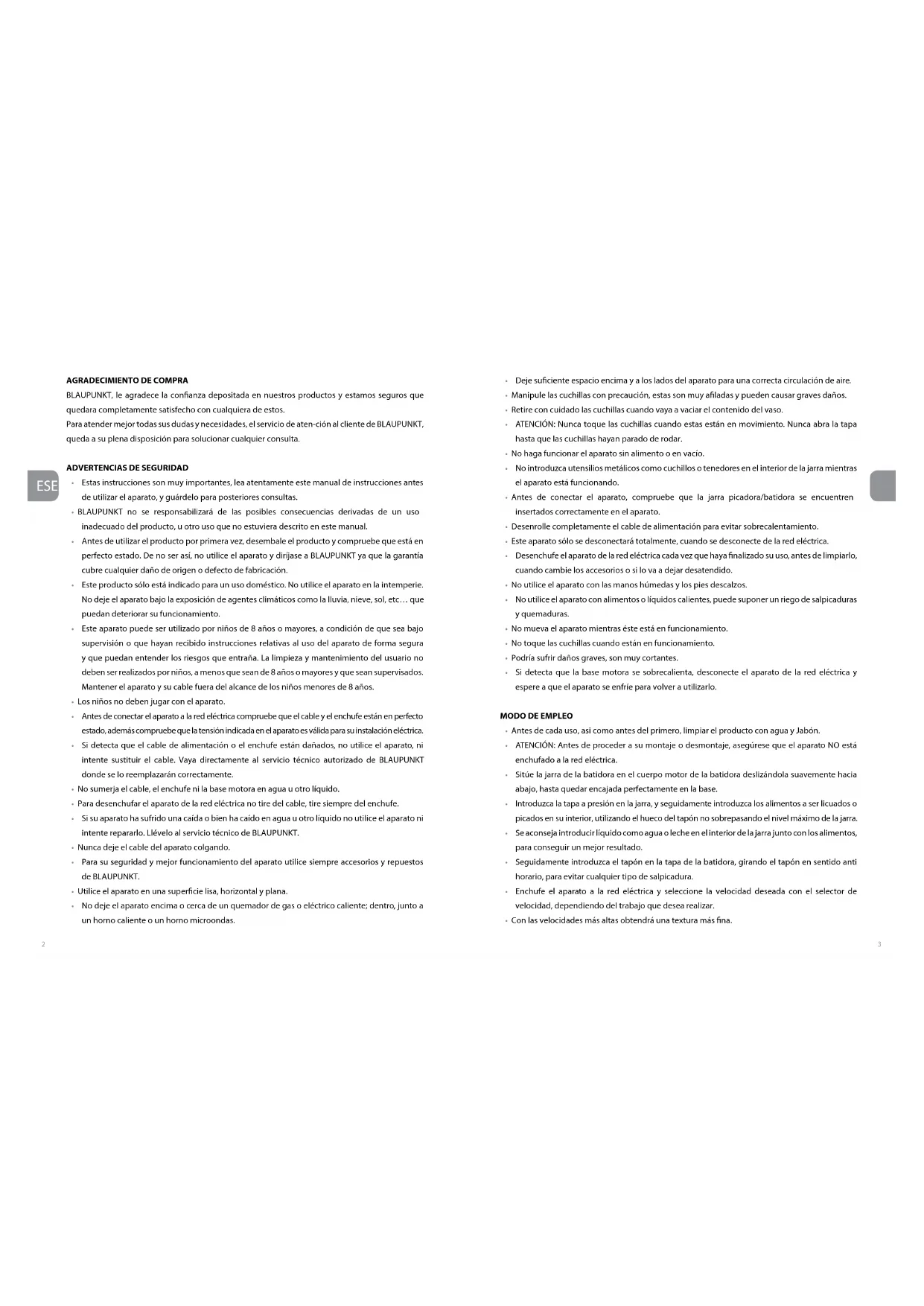 Gracias por haber adquirido este producto BLAUPUNKT, este aparato ha sido chequeado en todos sus componentes minuciosamente, por lo que garantizamos el funcionamiento correcto, pero para que esto sea así necesitamos que USTED lea atentamente el libro de instrucciones, pues así contribuirá al mejor rendimiento de este artículo. R.S.A garantiza al comprador de este producto, una garantía total de DOS AÑOS, rigiéndose por las condiciones establecidas cuya regulación se encuentra en el Real Decreto Legislativo 1/2007, de 16 de noviembre, por el que se aprueba el texto refundido de la Ley General para la Defensa de los Consumidores y Usuarios, (art. 114 a 127) R.S.A se compromete a que las reparaciones sean totalmente gratuitas, mano de obra y recambios, incluidos.El Servicio de Asistencia Técnica resolverá cualquier reparación que eventualmente pudiera precisar este aparato.Revise atentamente el LIBRO DE INSTRUCCIONES que se incluye, sobre el uso, mantenimiento y conservación del aparato. Cualquier anomalía que pudiera producirse por la inobservancia de tales instrucciones no quedará amparada por la garantía. La fecha de venta del aparato, a efectos de plazo de garantía, serála que gure en la factura de compra. Operatividad de la garantía: Por lo que se reere a todos aquellos defectos de conformidad detectados por el técnico, que se maniesten en un plazo de seis meses desde la entrega del bien, se supone que ya existían en dicha fecha, la intervención será totalmente gratuita, (a menos que ésta hipótesis sea incompatible con la naturaleza o la índole del defecto de conformidad). Durante los siguientes dieciocho meses, deberá ser el usuario quién demuestre. Que la falta de conformidad ya venía en el momento de la entrega.FABRICADO EN CHINA PARA BLAUPUNKTNombre del fabricante: RAMSONS, S.A.Dirección: Pedro Muñoz Torres nº 1Código Postal: 41006Ciudad: SEVILLADeclaramos bajo nuestra responsabilidad que el producrto:Descripción del producto: BATIDORA DE VASOModelo: BP4002Marca: BLAUPUNKTEs conforme con la legislación de la Unión Europea umpliendo las directrices 2004/108/EUSe aplican los estandares: EN 55014-1: 2006+A1:+A2:EN 55014-2: 1997+A1:+A2:EN 61000-3-2:2006+A1:+A2:EN 61000-3-3:2013Nombre: Vivek SadhwaniCargo: AdministradorFecha: 1 de octubre 2020Firma: