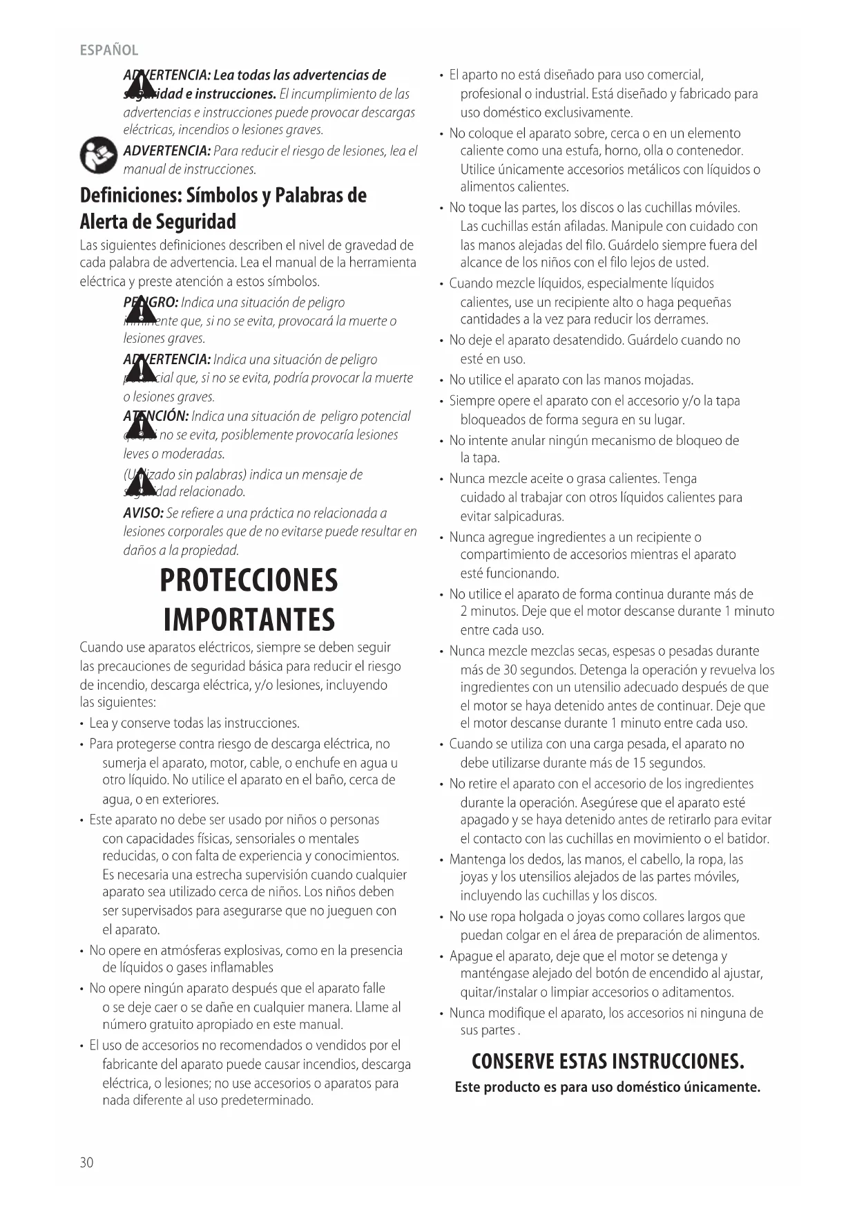 - Nunca modifique el aparato, los accesorios ni ninguna de sus partes . CONSERVE ESTAS INSTRUCCIONES. Este producto es para uso domésticoúnicamente. PROTECCIONES IMPORTANTES Cuando use aparatos eléctricos, siempre se deben seguir las precauciones de seguridad básica para reducir el riesgo de incendio, descarga eléctrica, y/o lesiones, incluyendo lassiguientes: