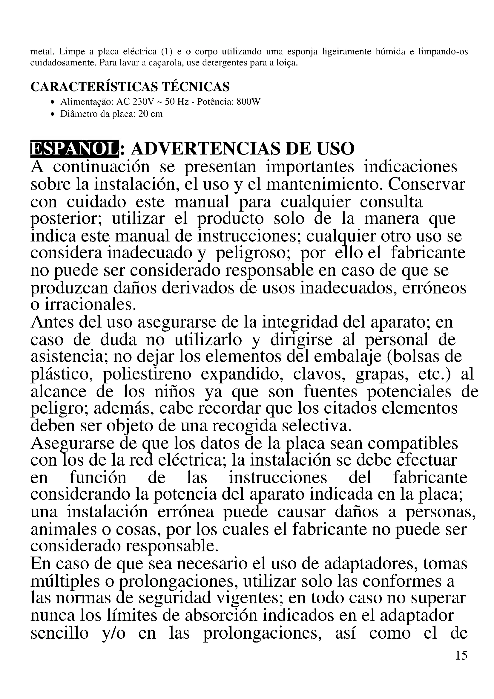 A continuación se presentan importantes indicaciones sobre la instalación, el uso y el mantenimiento. Conservar con cuidado este manual para cualquier consulta posterior; utilizar el producto solo de la manera que indica este manual de instrucciones; cualquier otro uso se considera inadecuado y peligroso; por ello el fabricante no puede ser considerado responsable en caso de que se produzcan daños derivados de usos inadecuados, erróneos o irracionales. Antes del uso asegurarse de la integridad del aparato; en caso de duda no utilizarlo y dirigirse al personal de asistencia; no dejar los elementos del embalaje (bolsas de plástico, poliestireno expandido, clavos, grapas, etc.) al alcance de los niños ya que son fuentes potenciales de peligro; además, cabe recordar que los citados elementos deben ser objeto de una recogida selectiva. Asegurarse de que los datos de la placa sean compatibles con los de la red eléctrica; la instalación se debe efectuar en función de las instrucciones del fabricante considerando la potencia del aparato indicada en la placa; una instalación errónea puede causar daños a personas, animales o cosas, por los cuales el fabricante no puede ser considerado responsable. En caso de que sea necesario el uso de adaptadores, tomas múltiples o prolongaciones, utilizar solo las conformes a las normas de seguridad vigentes; en todo caso no superar nunca los límites de absorción indicados en el adaptador sencillo y/o en las prolongaciones, así como el de16 potencia máxima marcado en el adaptador múltiple. No dejar el aparato conectado si no está en funcionamiento; conviene sacar la clavija de la red de alimentación cuando el aparato no se utilice. Desconecte siempre la unidad de la fuente de alimentación si la deja desatendida Las operaciones de limpieza deben efectuarse después de haber sacado la clavija. En caso de que al aparato esté fuera de uso y se haya decidido no repararlo, se recomienda inutilizarlo cortando el cable de alimentación. - No acercar el cable de alimentación a objetos cortantes o a superficies calientes y no tirar del mismo para sacar la clavija. No deje que cuelgue de la superficie de trabajo donde un niño pueda sostenerla. No utilizar el producto en caso de daños en el cable de alimentación, en la clavija o en caso de cortocircuitos; llevar a reparar el producto por parte de un centro de asistencia autorizado. - No exponer el producto a condiciones atmosféricas adversas como lluvia, humedad, hielo, etc. Conservarlo en lugares secos. No manejar o tocar el producto con las manos húmedas o los pies descalzos. - Este aparato puede ser utilizado por niños a partir de 8 años y por personas con capacidades físicas, sensoriales o mentales reducidas o con falta de experiencia o conocimiento si a dichas personas se ha asegurado una supervisión adecuada o bien si han recibido instrucciones sobre el uso seguro del aparato; las operaciones de limpieza y de mantenimiento no deben ser efectuadas por niños a no ser que tengan más de 8 años y estén supervisados. - Mantener el producto y el cable fuera del alcance de los niños menores de 8 años. Si el cable de alimentación está dañado, o en caso de una falla y/o mal funcionamiento, no manipule el aparato.17 Cualquier reparación debe ser realizada por el fabricante o por su servicio de asistencia técnica o, en cualquier caso, por una persona con una calificación similar, a fin de evitar cualquier riesgo. El incumplimiento de lo anterior puede comprometer la seguridad del dispositivo e invalidar los términos de la garantía. ATENCIÓN: el producto tiene una función de calentamiento. Las superficies pueden desarrollar altas temperaturas. La percepción de la temperatura es distinta para cada persona, utilizar el aparato con cautela. Tocar solo las superficies diseñadas para ser tocadas. Este aparato está diseñado para uso doméstico o similares: cocinas para el personal de tiendas, oficinas u otros centros de trabajo, para clientes de hoteles, moteles, hostales y similares. El aparato no está diseñado para su uso a través de temporizadores externos o mandos a distancia. Antes de cada uso, desenrolle el cable de alimentación. Utilice únicamente piezas de repuesto y accesorios originales. No someta el producto a impactos fuertes se producirán daños serios. Los niños no deben jugar con el aparato. Mantenga la unidad lejos de materiales inflamables, calor, puntos fríos y vapor.
