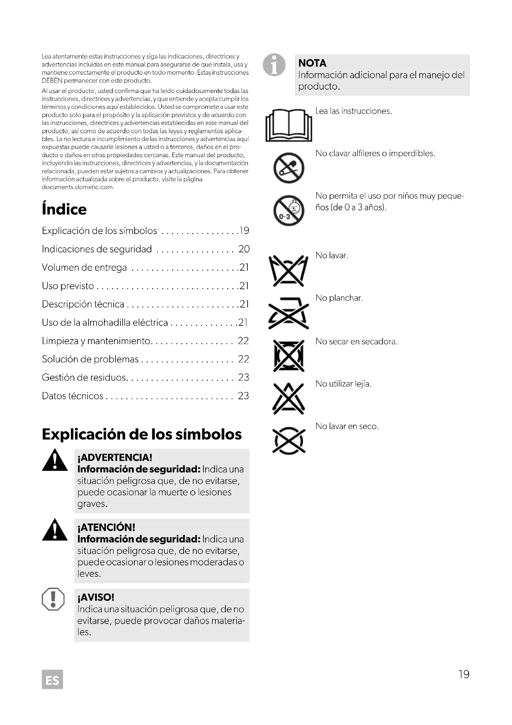 ¡ADVERTENCIA! Información de seguridad: Indica una situación peligrosa que, de no evitarse, puede ocasionar la muerte o lesiones graves. ¡ATENCIÓN! Información de seguridad: Indica una situación peligrosa que, de no evitarse, puede ocasionar o lesiones moderadas o leves. ¡AVISO! Indica una situación peligrosa que, de no evitarse, puede provocar daños materia- les. NOTA Información adicional para el manejo del producto. Lea las instrucciones.No clavar alfileres o imperdibles.No permita el uso por niños muy peque-ños (de 0 a 3 años).No lavar.No planchar.No secar en secadora.No utilizar lejía.No lavar en seco.20