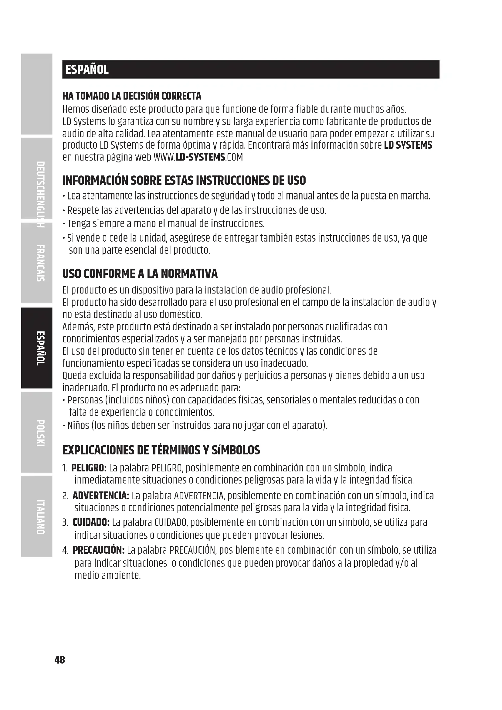 Hemos diseñado este producto para que funcione de forma fiable durante muchos años. LD Systems lo garantiza con su nombre y su larga experiencia como fabricante de productos de audio de alta calidad. Lea atentamente este manual de usuario para poder empezar a utilizar su producto LD Systems de forma óptima y rápida. Encontrará más información sobre LD SYSTEMS en nuestra página web WWW.LD-SYSTEMS.COM INFORMACIÓN SOBRE ESTAS INSTRUCCIONES DE USO