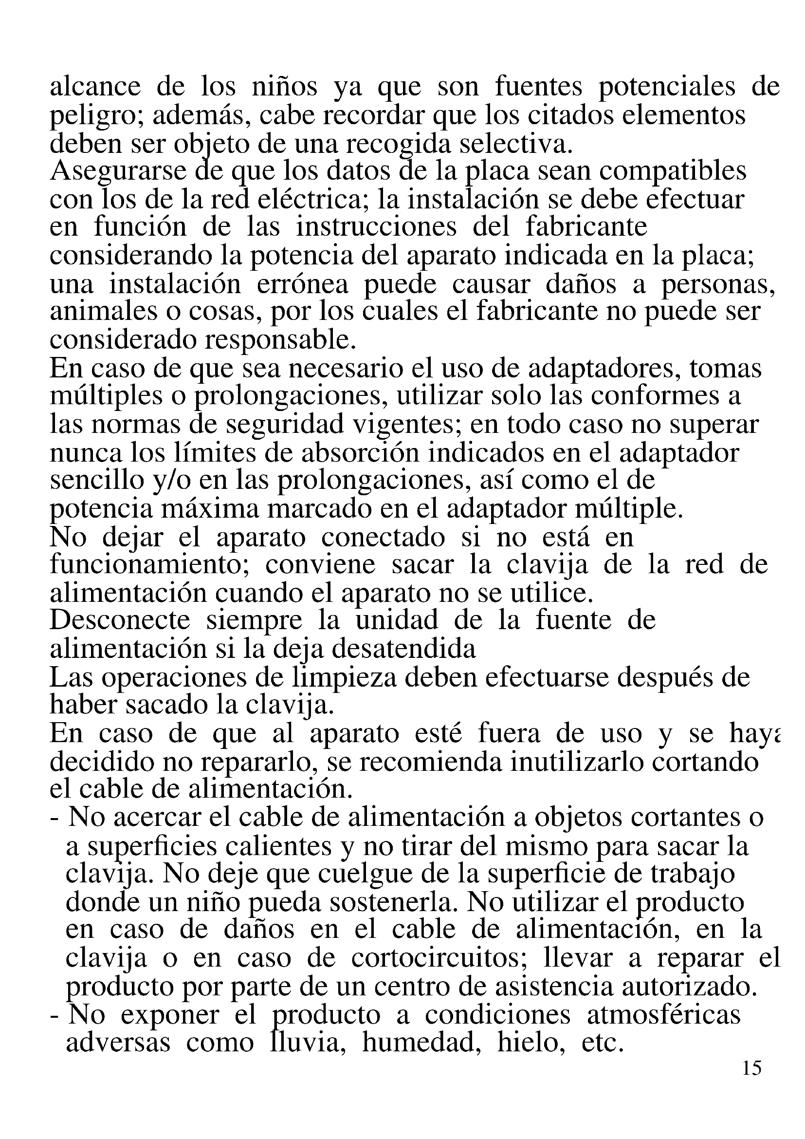 A continuación se presentan importantes indicaciones sobre la instalación, el uso y el mantenimiento. Conservar con cuidado este manual para cualquier consulta posterior; utilizar el producto solo de la manera que indica este manual de instrucciones; cualquier otro uso se considera inadecuado y peligroso; por ello el fabricante no puede ser considerado responsable en caso de que se produzcan daños derivados de usos inadecuados, erróneos o irracionales. Antes del uso asegurarse de la integridad del aparato; en caso de duda no utilizarlo y dirigirse al personal de asistencia; no dejar los elementos del embalaje (bolsas de plástico, poliestireno expandido, clavos, grapas, etc.) al15 alcance de los niños ya que son fuentes potenciales de peligro; además, cabe recordar que los citados elementos deben ser objeto de una recogida selectiva. Asegurarse de que los datos de la placa sean compatibles con los de la red eléctrica; la instalación se debe efectuar en función de las instrucciones del fabricante considerando la potencia del aparato indicada en la placa; una instalación errónea puede causar daños a personas, animales o cosas, por los cuales el fabricante no puede ser considerado responsable. En caso de que sea necesario el uso de adaptadores, tomas múltiples o prolongaciones, utilizar solo las conformes a las normas de seguridad vigentes; en todo caso no superar nunca los límites de absorción indicados en el adaptador sencillo y/o en las prolongaciones, así como el de potencia máxima marcado en el adaptador múltiple. No dejar el aparato conectado si no está en funcionamiento; conviene sacar la clavija de la red de alimentación cuando el aparato no se utilice. Desconecte siempre la unidad de la fuente de alimentación si la deja desatendida Las operaciones de limpieza deben efectuarse después de haber sacado la clavija. En caso de que al aparato esté fuera de uso y se haya decidido no repararlo, se recomienda inutilizarlo cortando el cable de alimentación. - No acercar el cable de alimentación a objetos cortantes o a superficies calientes y no tirar del mismo para sacar la clavija. No deje que cuelgue de la superficie de trabajo donde un niño pueda sostenerla. No utilizar el producto en caso de daños en el cable de alimentación, en la clavija o en caso de cortocircuitos; llevar a reparar el producto por parte de un centro de asistencia autorizado. - No exponer el producto a condiciones atmosféricas adversas como lluvia, humedad, hielo, etc.16 Conservarlo en lugares secos. No manejar o tocar el producto con las manos húmedas o los pies descalzos. - Este aparato puede ser utilizado por niños a partir de 8 años y por personas con capacidades físicas, sensoriales o mentales reducidas o con falta de experiencia o conocimiento si a dichas personas se ha asegurado una supervisión adecuada o bien si han recibido instrucciones sobre el uso seguro del aparato; las operaciones de limpieza y de mantenimiento no deben ser efectuadas por niños a no ser que tengan más de 8 años y estén supervisados. - Los niños no deben jugar con el aparato. - Mantener el producto y el cable fuera del alcance de los niños menores de 8 años. Si el cable de alimentación está dañado, o en caso de una falla y/o mal funcionamiento, no manipule el aparato. Cualquier reparación debe ser realizada por el fabricante o por su servicio de asistencia técnica o, en cualquier caso, por una persona con una calificación similar, a fin de evitar cualquier riesgo. El incumplimiento de lo anterior puede comprometer la seguridad del dispositivo e invalidar los términos de la garantía. Este aparato está diseñado para uso doméstico o similares: cocinas para el personal de tiendas, oficinas u otros centros de trabajo, para clientes de hoteles, moteles, hostales y similares. El aparato no está diseñado para su uso a través de temporizadores externos o mandos a distancia. Antes de cada uso, desenrolle el cable de alimentación. Utilice únicamente piezas de repuesto y accesorios originales. No someta el producto a impactos fuertes se producirán daños serios. Mantenga la unidad lejos de materiales inflamables, calor, puntos fríos y vapor.17