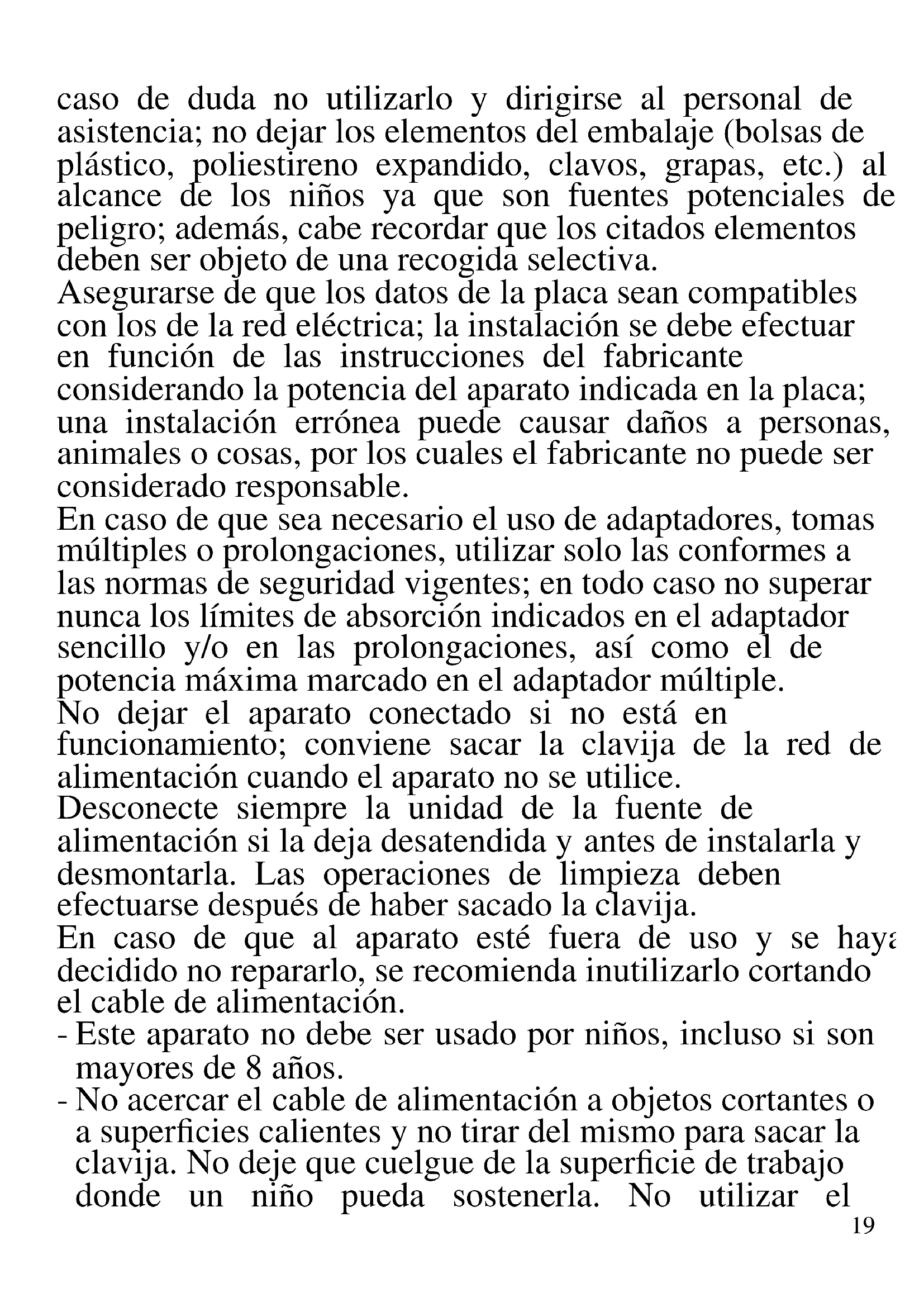 A continuación se presentan importantes indicaciones sobre la instalación, el uso y el mantenimiento. Conservar con cuidado este manual para cualquier consulta posterior; utilizar el producto solo de la manera que indica este manual de instrucciones; cualquier otro uso se considera inadecuado y peligroso; por ello el fabricante no puede ser considerado responsable en caso de que se produzcan daños derivados de usos inadecuados, erróneos o irracionales. Antes del uso asegurarse de la integridad del aparato; en19 caso de duda no utilizarlo y dirigirse al personal de asistencia; no dejar los elementos del embalaje (bolsas de plástico, poliestireno expandido, clavos, grapas, etc.) al alcance de los niños ya que son fuentes potenciales de peligro; además, cabe recordar que los citados elementos deben ser objeto de una recogida selectiva. Asegurarse de que los datos de la placa sean compatibles con los de la red eléctrica; la instalación se debe efectuar en función de las instrucciones del fabricante considerando la potencia del aparato indicada en la placa; una instalación errónea puede causar daños a personas, animales o cosas, por los cuales el fabricante no puede ser considerado responsable. En caso de que sea necesario el uso de adaptadores, tomas múltiples o prolongaciones, utilizar solo las conformes a las normas de seguridad vigentes; en todo caso no superar nunca los límites de absorción indicados en el adaptador sencillo y/o en las prolongaciones, así como el de potencia máxima marcado en el adaptador múltiple. No dejar el aparato conectado si no está en funcionamiento; conviene sacar la clavija de la red de alimentación cuando el aparato no se utilice. Desconecte siempre la unidad de la fuente de alimentación si la deja desatendida y antes de instalarla y desmontarla. Las operaciones de limpieza deben efectuarse después de haber sacado la clavija. En caso de que al aparato esté fuera de uso y se haya decidido no repararlo, se recomienda inutilizarlo cortando el cable de alimentación. - Este aparato no debe ser usado por niños, incluso si son mayores de 8 años. - No acercar el cable de alimentación a objetos cortantes o a superficies calientes y no tirar del mismo para sacar la clavija. No deje que cuelgue de la superficie de trabajo donde un niño pueda sostenerla. No utilizar el20 producto en caso de daños en el cable de alimentación, en la clavija o en caso de cortocircuitos; llevar a reparar el producto por parte de un centro de asistencia autorizado. - No exponer el producto a condiciones atmosféricas adversas como lluvia, humedad, hielo, etc. Conservarlo en lugares secos. No manejar o tocar el producto con las manos húmedas o los pies descalzos. - Este aparato puede ser utilizado por personas con capacidades físicas, sensoriales o mentales reducidas o con falta de experiencia o conocimiento si a dichas personas se ha asegurado una supervisión o bien si han recibido instrucciones sobre el uso seguro del aparato. - Los niños no deben jugar con el aparato. - Mantener el producto y el cable fuera del alcance de los niños menores de 8 años. - No apto para uso comercial. Solo para uso doméstico ATENCIÓN: el producto tiene una función de calentamiento. Las superficies pueden desarrollar altas temperaturas. La percepción de la temperatura es distinta para cada persona, utilizar el aparato con cautela. Tocar solo las superficies diseñadas para ser tocadas, y usar agarradores o guantes de cocina. En caso de avería y/o de funcionamiento anómalo no manipular el aparato. Para una posible reparación, dirigirse únicamente a un centro autorizado por el fabricante y solicitar el uso de recambios originales. El incumplimiento de lo indicado anteriormente puede comprometer la seguridad del aparato y anular las condiciones de la garantía. Este aparato está diseñado para uso doméstico o similares: cocinas para el personal de tiendas, oficinas u otros centros de trabajo, para clientes de hoteles, moteles, hostales y similares. Antes de cada uso, desenrolle el cable de alimentación.21 El aparato no está diseñado para su uso a través de temporizadores externos o mandos a distancia. Utilice únicamente piezas de repuesto y accesorios originales. No someta el producto a impactos fuertes se producirán daños serios.