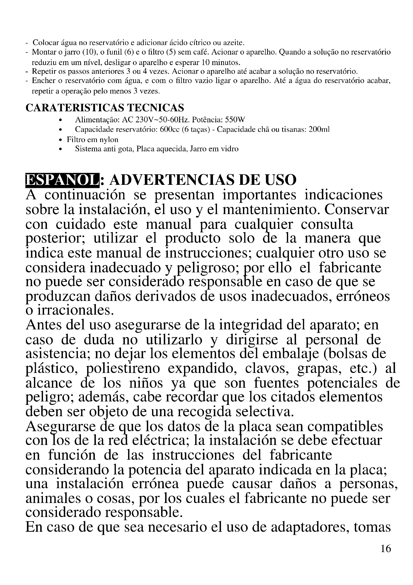 - Abra la tapa (1) y vierta agua en el depósito (2). No llene por encima del nivel máximo (MAX) indicado en el depósito. - Coloque el filtro de nylon (5) en el embudo de infusión (6). - Con el medidor dosificador introduzca en el filtro (5) café o café de cebada. Una cuchara medidora por cada taza de agua en el tanque (2) (si se llena hasta 4, ponga 4 cucharadas medidoras de café). Cierre la tapa (1). - Coloque la jarra (10) sobre la placa caliente (3), haciendo coincidir el orificio de la tapa con la boquilla de salida del café (8). - Conecte el enchufe a la toma de corriente y encienda el aparato pulsando el botón de encendido (4). La luz azul en el botón se enciende e indica el funcionamiento. - Espere hasta que se termine por completo el agua presente en el depósito. - En este punto la bebida está lista en la jarra (10) y la placa caliente (3) la mantiene caliente. - Para apagar el aparato, pulse de nuevo el botón (4), de lo contrario permanecerá encendido durante 40 minutos (solo para el mantenimiento en caliente) y se apagará automáticamente.20 PREPARACIÓN DE TÉ, INFUSIONES Y CAFÉ CARGADO ATENCIÓN: antes de preparar té e infusiones, limpie cuidadosamente el filtro de nylon de cualquier residuo de café. Debe seguirse el procedimiento a continuación si se desea preparar té, infusiones o café más cargado y, por tanto, más fuerte. - Abra la tapa (1) y vierta MÁXIMO 200cc de agua en el depósito (2). - Coloque el filtro de nylon (5) en el embudo de infusión (6). - Con el medidor dosificador introduzca en el filtro (5) café o café de cebada, o bien té o infusiones. Un cuchara medidora por cada taza de agua en el tanque (2). Cierre la tapa (1). - NO COLOQUE LA JARRA (10) sobre la placa caliente (3). De esta forma, el pico antigoteo impedirá la salida y el líquido se dejará en infusión. - Conecte el enchufe a la toma de corriente y encienda el aparato pulsando el botón de encendido (4). La luz azul en el botón se enciende e indica el funcionamiento. - Espere hasta que el agua del depósito se termine por completo y deje en infusión durante el tiempo deseado. - Cuando termine la infusión, coloque la jarra (10) sobre la placa caliente (3) para que salga la bebida. En este punto la bebida está lista en la jarra (10) y la placa caliente (3) la mantiene caliente. - Para apagar el aparato, pulse de nuevo el botón (4), de lo contrario permanecerá encendido durante 40 minutos (solo para el mantenimiento en caliente) y se apagará automáticamente. LIMPIEZA - Desconecte el enchufe de la toma de corriente y deje enfriar todas las partes antes de realizar cualquier operación de limpieza. No sumerja el cuerpo principal (12) en agua. En todo caso, evite que les caigan a estas partes salpicaduras de agua o de otros líquidos. Las partes extraíbles se pueden limpiar bajo un chorro de agua. No use lavavajillas y seque completamente las partes antes de volver a montarlas. LIMPIEZA ANTICAL Para evitar la formación de incrustaciones de cal se recomienda realizar periódicamente una limpieza especial, siguiendo las instrucciones que se indican: - Vierta agua en el depósito y añada ácido cítrico o vinagre. - Monte la jarra (10), el embudo (6) y el filtro (5) sin café. Accione el producto. Cuando la solución presente en el depósito haya caído una marca, apague el producto y espere 10 minutos. - Repita la operación 3-4 veces. Accione el producto hasta terminar la solución presente en el depósito. - Llene el depósito con agua y ponga en funcionamiento el aparato con el filtro vacío, hasta que el agua del recipiente se termine. Repita la operación al menos 3 veces