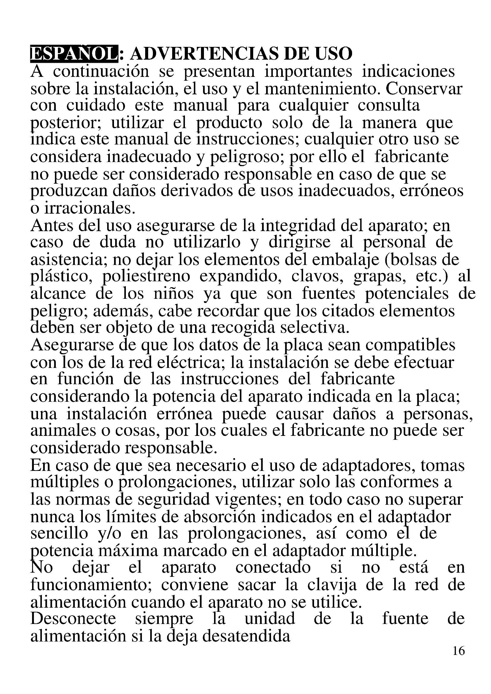 A continuación se presentan importantes indicaciones sobre la instalación, el uso y el mantenimiento. Conservar con cuidado este manual para cualquier consulta posterior; utilizar el producto solo de la manera que indica este manual de instrucciones; cualquier otro uso se considera inadecuado y peligroso; por ello el fabricante no puede ser considerado responsable en caso de que se produzcan daños derivados de usos inadecuados, erróneos o irracionales. Antes del uso asegurarse de la integridad del aparato; en caso de duda no utilizarlo y dirigirse al personal de asistencia; no dejar los elementos del embalaje (bolsas de plástico, poliestireno expandido, clavos, grapas, etc.) al alcance de los niños ya que son fuentes potenciales de peligro; además, cabe recordar que los citados elementos deben ser objeto de una recogida selectiva. Asegurarse de que los datos de la placa sean compatibles con los de la red eléctrica; la instalación se debe efectuar en función de las instrucciones del fabricante considerando la potencia del aparato indicada en la placa; una instalación errónea puede causar daños a personas, animales o cosas, por los cuales el fabricante no puede ser considerado responsable. En caso de que sea necesario el uso de adaptadores, tomas múltiples o prolongaciones, utilizar solo las conformes a las normas de seguridad vigentes; en todo caso no superar nunca los límites de absorción indicados en el adaptador sencillo y/o en las prolongaciones, así como el de potencia máxima marcado en el adaptador múltiple. No dejar el aparato conectado si no está en funcionamiento; conviene sacar la clavija de la red de alimentación cuando el aparato no se utilice. Desconecte siempre la unidad de la fuente de alimentación si la deja desatendida17 Las operaciones de limpieza deben efectuarse después de haber sacado la clavija. En caso de que al aparato esté fuera de uso y se haya decidido no repararlo, se recomienda inutilizarlo cortando el cable de alimentación. - No acercar el cable de alimentación a objetos cortantes o a superficies calientes y no tirar del mismo para sacar la clavija. No deje que cuelgue de la superficie de trabajo donde un niño pueda sostenerla. No utilizar el producto en caso de daños en el cable de alimentación, en la clavija o en caso de cortocircuitos; llevar a reparar el producto por parte de un centro de asistencia autorizado. - No exponer el producto a condiciones atmosféricas adversas como lluvia, humedad, hielo, etc. Conservarlo en lugares secos. No manejar o tocar el producto con las manos húmedas o los pies descalzos. - Este aparato puede ser utilizado por niños a partir de 8 años y por personas con capacidades físicas, sensoriales o mentales reducidas o con falta de experiencia o conocimiento si a dichas personas se ha asegurado una supervisión adecuada o bien si han recibido instrucciones sobre el uso seguro del aparato; las operaciones de limpieza y de mantenimiento no deben ser efectuadas por niños a no ser que tengan más de 8 años y estén supervisados. - Los niños no deben jugar con el aparato. - Mantener el producto y el cable fuera del alcance de los niños menores de 8 años. Si el cable de alimentación está dañado, o en caso de una falla y/o mal funcionamiento, no manipule el aparato. Cualquier reparación debe ser realizada por el fabricante o por su servicio de asistencia técnica o, en cualquier caso, por una persona con una calificación similar, a fin de evitar cualquier riesgo. El incumplimiento de lo18 anterior puede comprometer la seguridad del dispositivo e invalidar los términos de la garantía. ATENCIÓN: el producto tiene una función de calentamiento. Las superficies pueden desarrollar altas temperaturas. La percepción de la temperatura es distinta para cada persona, utilizar el aparato con cautela. Tocar solo las superficies diseñadas para ser tocadas. Este aparato está diseñado para uso doméstico o similares: cocinas para el personal de tiendas, oficinas u otros centros de trabajo, para clientes de hoteles, moteles, hostales y similares. El aparato no está diseñado para su uso a través de temporizadores externos o mandos a distancia. Antes de cada uso, desenrolle el cable de alimentación. Utilice únicamente piezas de repuesto y accesorios originales. No someta el producto a impactos fuertes se producirán daños serios. Mantenga la unidad lejos de materiales inflamables, calor, puntos fríos y vapor.