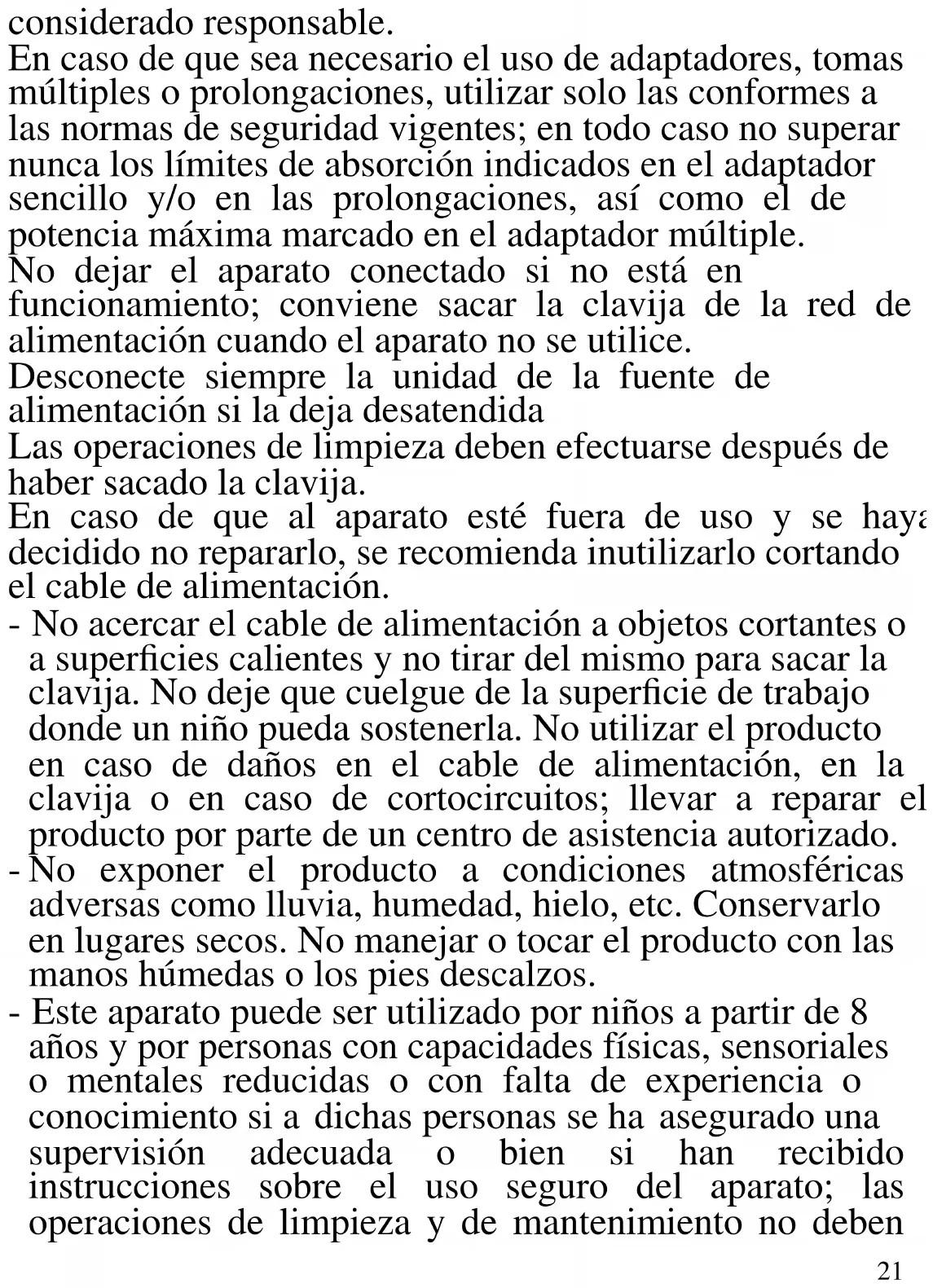 A continuación se presentan importantes indicaciones sobre la instalación, el uso y el mantenimiento. Conservar con cuidado este manual para cualquier consulta posterior; utilizar el producto solo de la manera que indica este manual de instrucciones; cualquier otro uso se considera inadecuado y peligroso; por ello el fabricante no puede ser considerado responsable en caso de que se produzcan daños derivados de usos inadecuados, erróneos o irracionales. Antes del uso asegurarse de la integridad del aparato; en caso de duda no utilizarlo y dirigirse al personal de asistencia; no dejar los elementos del embalaje (bolsas de plástico, poliestireno expandido, clavos, grapas, etc.) al alcance de los niños ya que son fuentes potenciales de peligro; además, cabe recordar que los citados elementos deben ser objeto de una recogida selectiva. Asegurarse de que los datos de la placa sean compatibles con los de la red eléctrica; la instalación se debe efectuar en función de las instrucciones del fabricante considerando la potencia del aparato indicada en la placa; una instalación errónea puede causar daños a personas, animales o cosas, por los cuales el fabricante no puede ser21 considerado responsable. En caso de que sea necesario el uso de adaptadores, tomas múltiples o prolongaciones, utilizar solo las conformes a las normas de seguridad vigentes; en todo caso no superar nunca los límites de absorción indicados en el adaptador sencillo y/o en las prolongaciones, así como el de potencia máxima marcado en el adaptador múltiple. No dejar el aparato conectado si no está en funcionamiento; conviene sacar la clavija de la red de alimentación cuando el aparato no se utilice. Desconecte siempre la unidad de la fuente de alimentación si la deja desatendida Las operaciones de limpieza deben efectuarse después de haber sacado la clavija. En caso de que al aparato esté fuera de uso y se haya decidido no repararlo, se recomienda inutilizarlo cortando el cable de alimentación. - No acercar el cable de alimentación a objetos cortantes o a superficies calientes y no tirar del mismo para sacar la clavija. No deje que cuelgue de la superficie de trabajo donde un niño pueda sostenerla. No utilizar el producto en caso de daños en el cable de alimentación, en la clavija o en caso de cortocircuitos; llevar a reparar el producto por parte de un centro de asistencia autorizado. - No exponer el producto a condiciones atmosféricas adversas como lluvia, humedad, hielo, etc. Conservarlo en lugares secos. No manejar o tocar el producto con las manos húmedas o los pies descalzos. - Este aparato puede ser utilizado por niños a partir de 8 años y por personas con capacidades físicas, sensoriales o mentales reducidas o con falta de experiencia o conocimiento si a dichas personas se ha asegurado una supervisión adecuada o bien si han recibido instrucciones sobre el uso seguro del aparato; las operaciones de limpieza y de mantenimiento no deben22 ser efectuadas por niños a no ser que tengan más de 8 años y estén supervisados. - Los niños no deben jugar con el aparato. - Mantener el producto y el cable fuera del alcance de los niños menores de 8 años. Si el cable de alimentación está dañado, o en caso de una falla y/o mal funcionamiento, no manipule el aparato. Cualquier reparación debe ser realizada por el fabricante o por su servicio de asistencia técnica o, en cualquier caso, por una persona con una calificación similar, a fin de evitar cualquier riesgo. El incumplimiento de lo anterior puede comprometer la seguridad del dispositivo e invalidar los términos de la garantía. ATENCIÓN: el producto tiene una función de calentamiento. Las superficies pueden desarrollar altas temperaturas. La percepción de la temperatura es distinta para cada persona, utilizar el aparato con cautela. Tocar solo las superficies diseñadas para ser tocadas. Este aparato está diseñado para uso doméstico o similares: cocinas para el personal de tiendas, oficinas u otros centros de trabajo, para clientes de hoteles, moteles, hostales y similares. El aparato no está diseñado para su uso a través de temporizadores externos o mandos a distancia. Antes de cada uso, desenrolle el cable de alimentación. Utilice únicamente piezas de repuesto y accesorios originales. No someta el producto a impactos fuertes se producirán daños serios. Mantenga la unidad lejos de materiales inflamables, calor, puntos fríos y vapor.