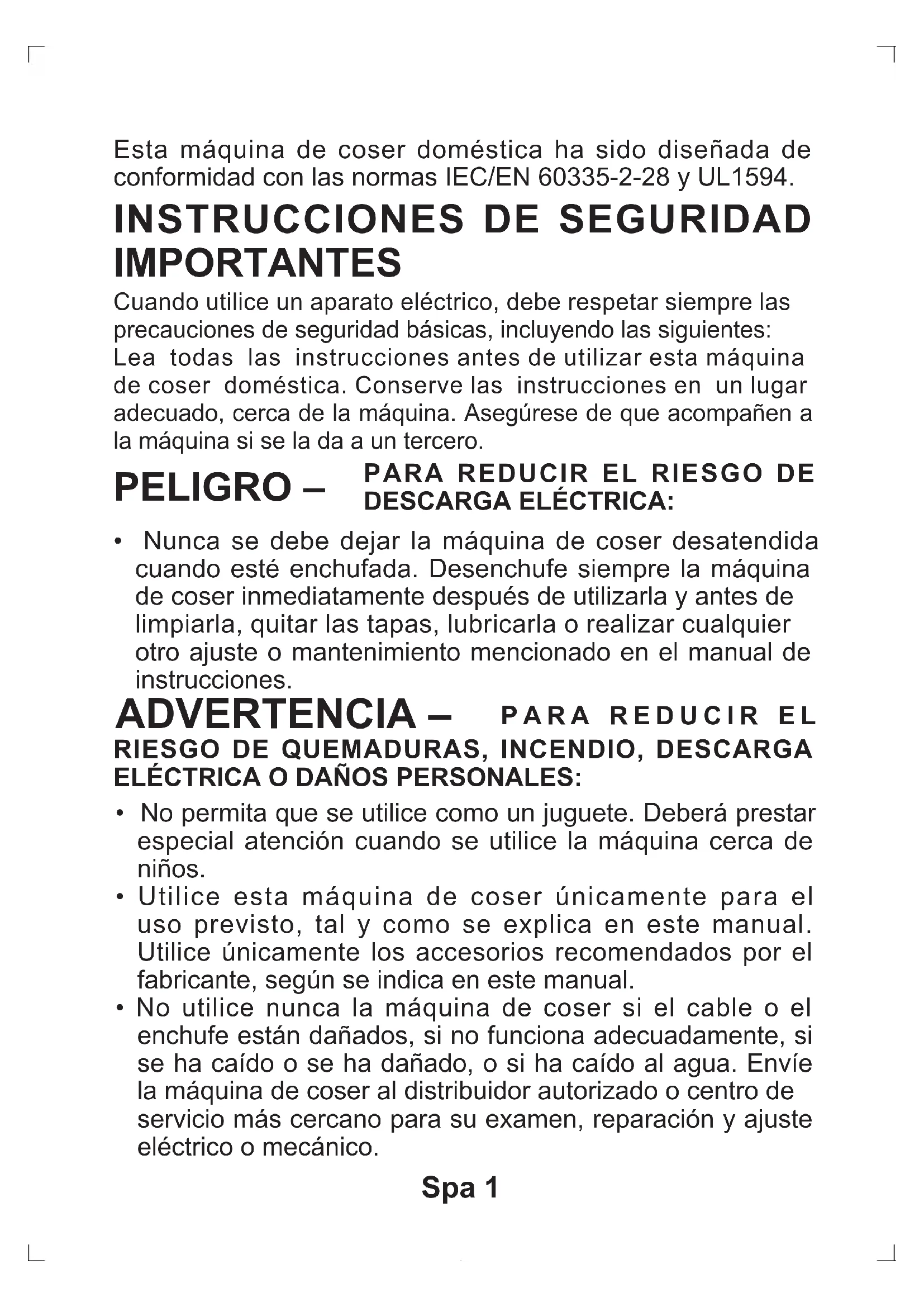- Esta máquina de coser está provista de un doble aislamiento. Use exclusivamente piezas de repuesto idénticas. Consulte las instrucciones sobre el mantenimiento de los aparatos provistos de doble aislamiento.Spa 4