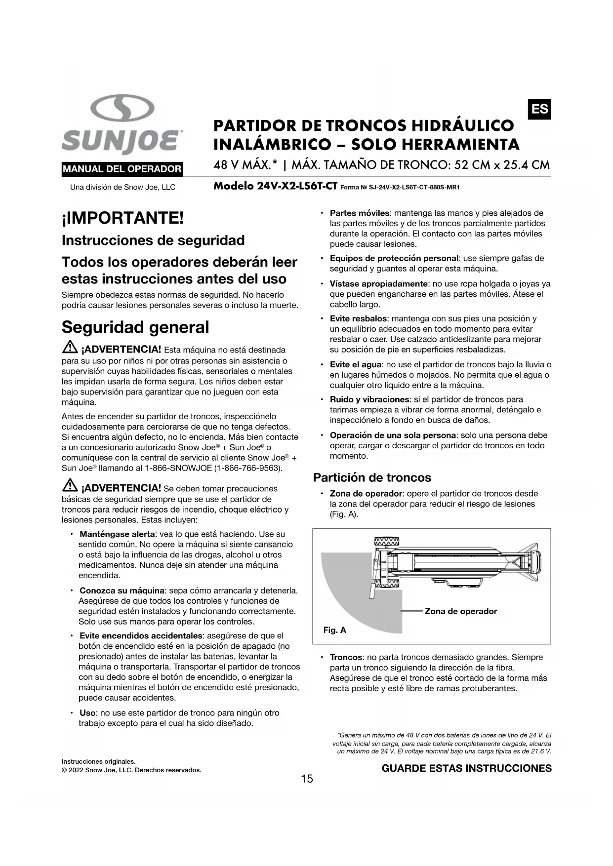 24V-X2-LS6T-CT - Divisora de leña Sun Joe - Manual de uso y guía de instrucciones gratis