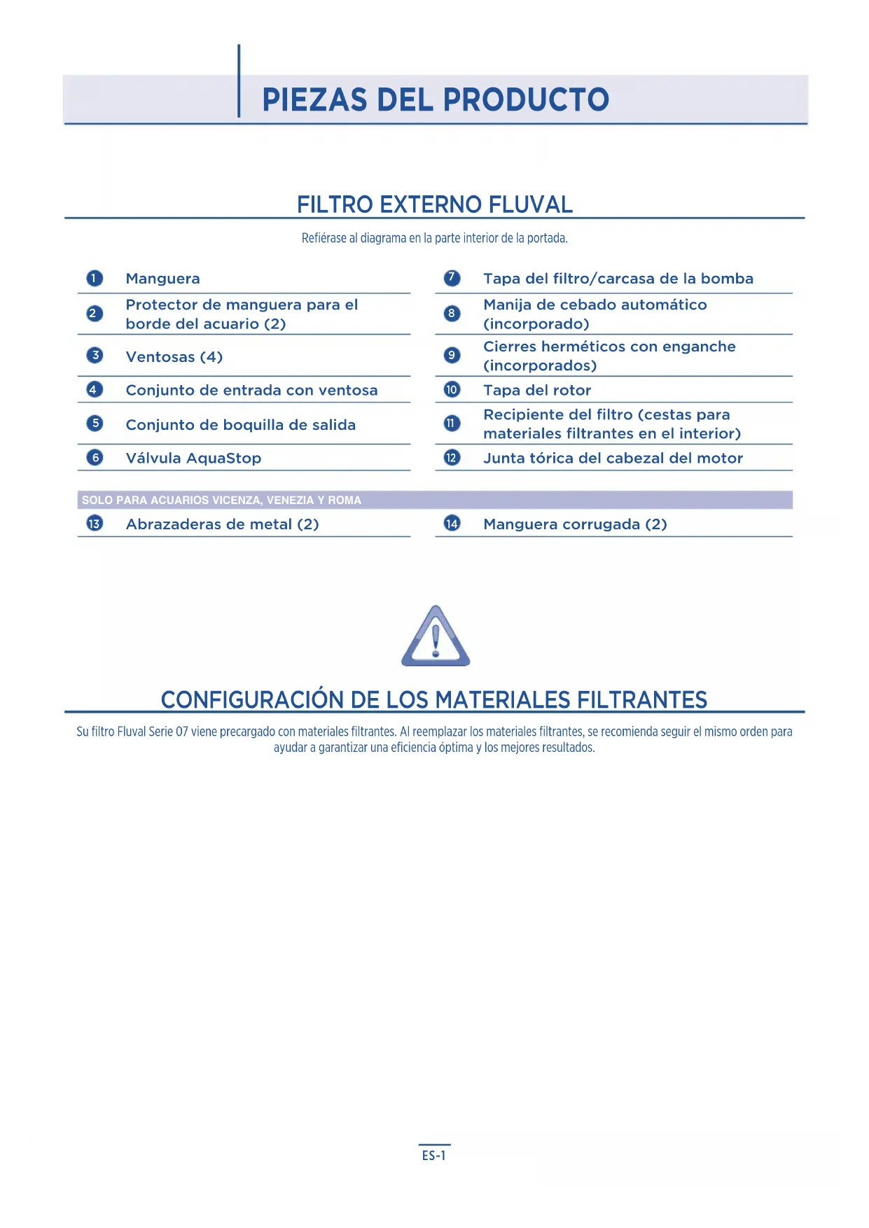 Su filtro Fluval Serie 07 viene precargado con materiales filtrantes. Al reemplazar los materiales filtrantes, se recomienda seguir el mismo orden para ayudar a garantizar una eficiencia óptima y los mejores resultados.MEDIDAS DE SEGURIDAD IMPORTANTES ADVERTENCIA: Para evitar lesiones, se deben tener en cuenta las precauciones básicas de seguridad, incluidas las que se detallan a continuación.3. ADVERTENCIA: Es necesario supervisar de cerca el aparato cuando está siendo utilizado por niños o si hay niños cerca. Este aparato puede ser usado por niños mayores de 8 años y personas con capacidades físicas, sensoriales o mentales reducidas, o personas sin experiencia ni conocimiento, siempre que sean supervisa- das o hayan recibido instrucciones sobre el uso seguro del aparato de parte de una persona responsable de su seguridad y entiende todos los posibles peligros. Los niños no deben jugar con el aparato. La limpieza y mantenimiento de la unidad no debe ser realizada por niños sin supervisión.