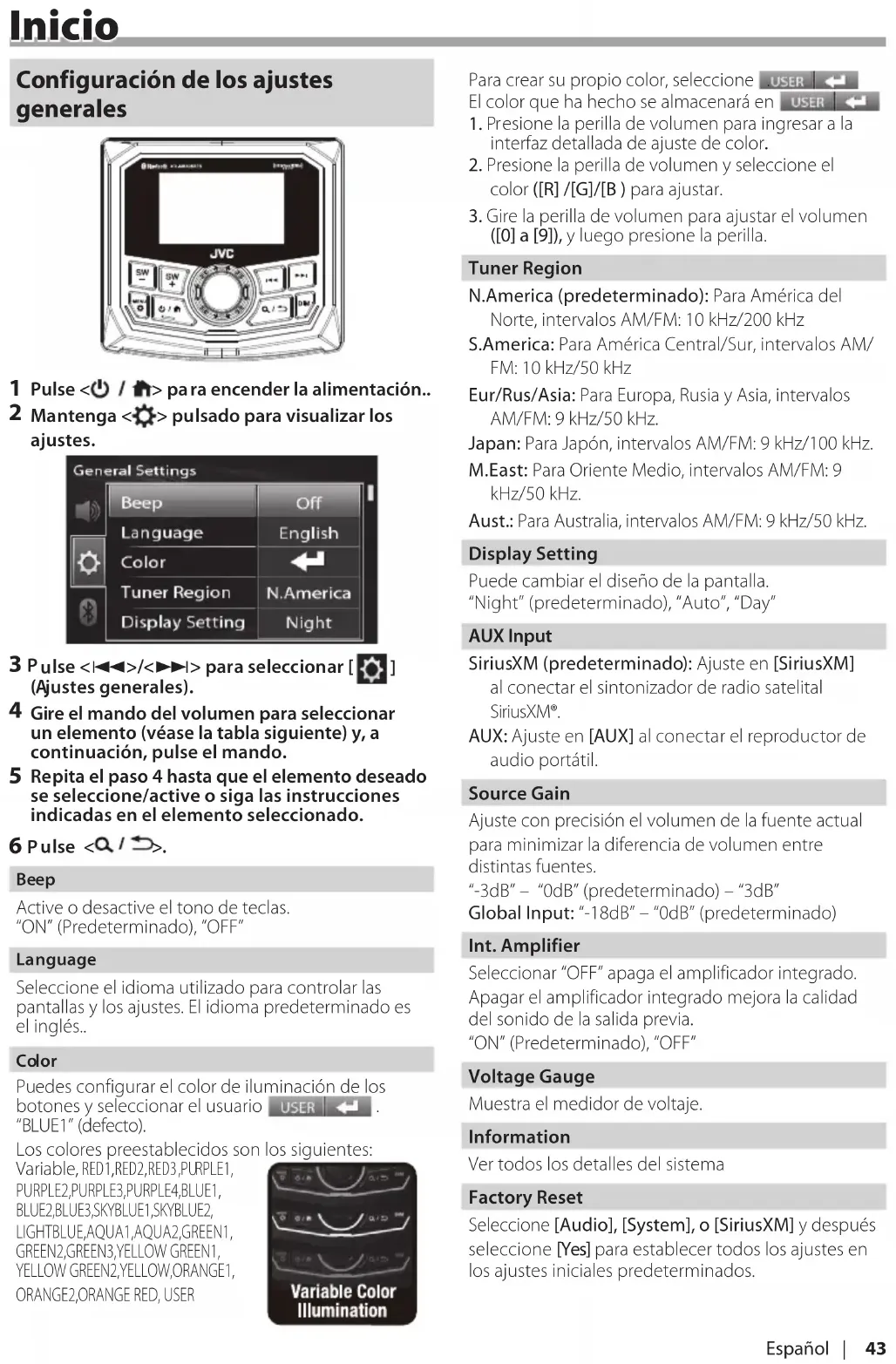 ([0] a [9]), y luego presione la perilla. Tuner Region N.America (predeterminado): Para América del Norte, intervalos AM/FM: 10 kHz/200 kHz S.America: Para América Central/Sur, intervalos AM/ FM: 10 kHz/50 kHz Eur/Rus/Asia: Para Europa, Rusia y Asia, intervalos AM/FM: 9 kHz/50 kHz. Japan: Para Japón, intervalos AM/FM: 9 kHz/100 kHz. M.East: Para Oriente Medio, intervalos AM/FM: 9 kHz/50 kHz. Aust.: Para Australia, intervalos AM/FM: 9 kHz/50 kHz. Display Setting Puede cambiar el diseño de la pantalla. “Night” (predeterminado), “Auto”, “Day” AUX Input SiriusXM (predeterminado): Ajuste en [SiriusXM] al conectar el sintonizador de radio satelital SiriusXM®. AUX: Ajuste en [AUX] al conectar el reproductor de audio portátil. Source Gain Ajuste con precisión el volumen de la fuente actual para minimizar la diferencia de volumen entre distintas fuentes. “-3dB” – “0dB” (predeterminado) – “3dB” Global Input: “-18dB” – “0dB” (predeterminado) Int. Amplifier Seleccionar “OFF” apaga el amplificador integrado. Apagar el amplificador integrado mejora la calidad del sonido de la salida previa. “ON” (Predeterminado), “OFF” Voltage Gauge Muestra el medidor de voltaje. Information Ver todos los detalles del sistema Factory Reset Seleccione [Audio], [System], o [SiriusXM] y después seleccione [Yes] para establecer todos los ajustes en los ajustes iniciales predeterminados.44 Con ceptos básicos