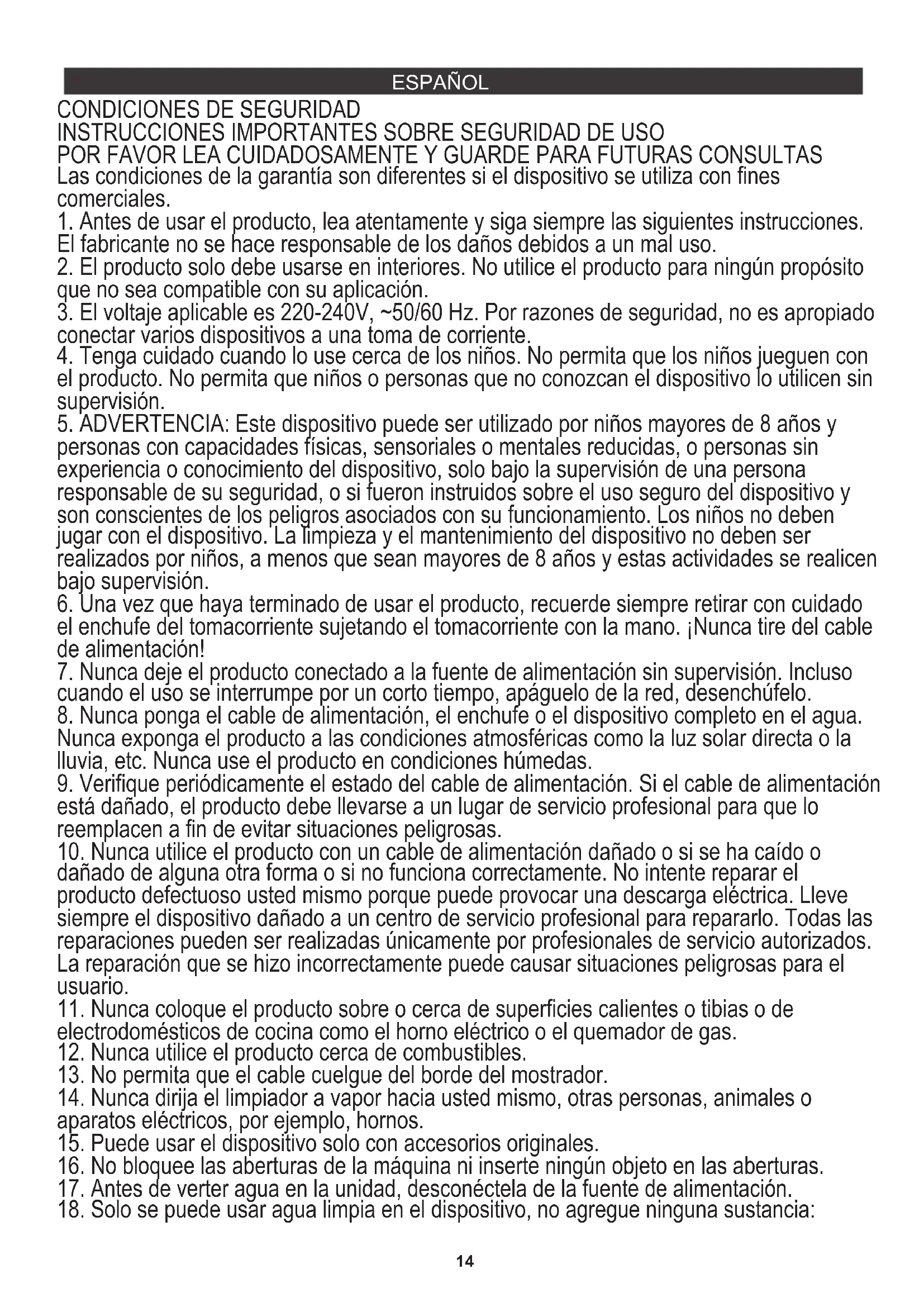 14. Nunca dirija el limpiador a vapor hacia usted mismo, otras personas, animales o