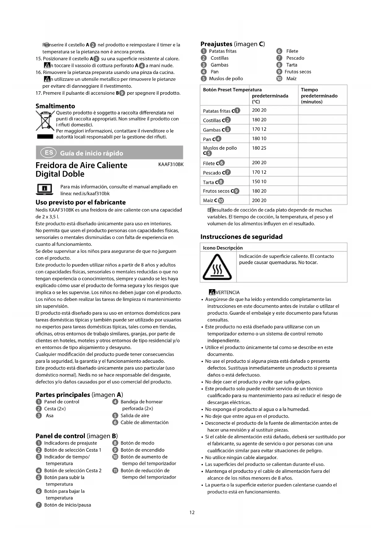 Guía de inicio rápido Freidora de Aire Caliente Digital Doble KAAF310BKPara más información, consulte el manual ampliado en línea: ned.is/kaaf310bk Uso previsto por el fabricante Nedis KAAF310BK es una freidora de aire caliente con una capacidad de 2 x 3,5 l.Este producto está diseñado únicamente para uso en interiores.No permita que usen el producto personas con capacidades físicas, sensoriales o mentales disminuidas o con falta de experiencia en cuanto al funcionamiento.Se debe supervisar a los niños para asegurarse de que no jueguen con el producto.Este producto lo pueden utilizar niños a partir de 8 años y adultos con capacidades físicas, sensoriales o mentales reducidas o que no tengan experiencia o conocimientos, siempre y cuando se les haya explicado cómo usar el producto de forma segura y los riesgos que implica o se les supervise. Los niños no deben jugar con el producto. Los niños no deben realizar las tareas de limpieza ni mantenimiento sin supervisión.El producto está diseñado para su uso en entornos domésticos para tareas domésticas típicas y también puede ser utilizado por usuarios no expertos para tareas domésticas típicas, tales como en tiendas, ocinas, otros entornos de trabajo similares, granjas, por parte de clientes en hoteles, moteles y otros entornos de tipo residencial y/o en entornos de tipo alojamiento y desayuno.Cualquier modicación del producto puede tener consecuencias para la seguridad, la garantía y el funcionamiento adecuado.Este producto está diseñado únicamente para uso particular (uso doméstico normal). Nedis no se hace responsable del desgaste, defectos y/o daños causados por el uso comercial del producto. Partes principales (imagen A) 1 Panel de control2 Cesta (2×)3 Asa4 Bandeja de hornear perforada (2×)5 Salida de aire6 Cable de alimentación Panel de control (imagen B) 1 Indicadores de preajuste2 Botón de selección Cesta 13 Indicador de tiempo/temperatura4 Botón de selección Cesta 25 Botón para subir la temperatura6 Botón para bajar la temperatura7 Botón de inicio/pausa8 Botón de modo9 Botón de encendidoq Botón de aumento de tiempo del temporizadorw Botón de reducción de tiempo del temporizador13