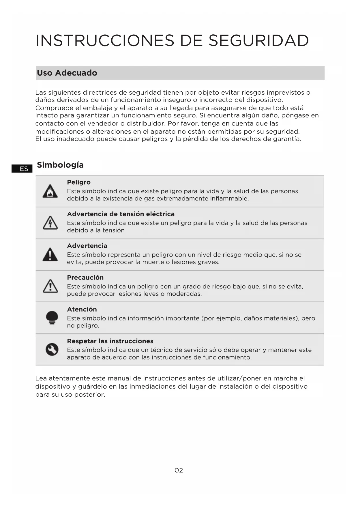 ESPeligro Advertencia de tensión eléctrica Advertencia Precaución Atención Respetar las instrucciones Uso Adecuado Simbología