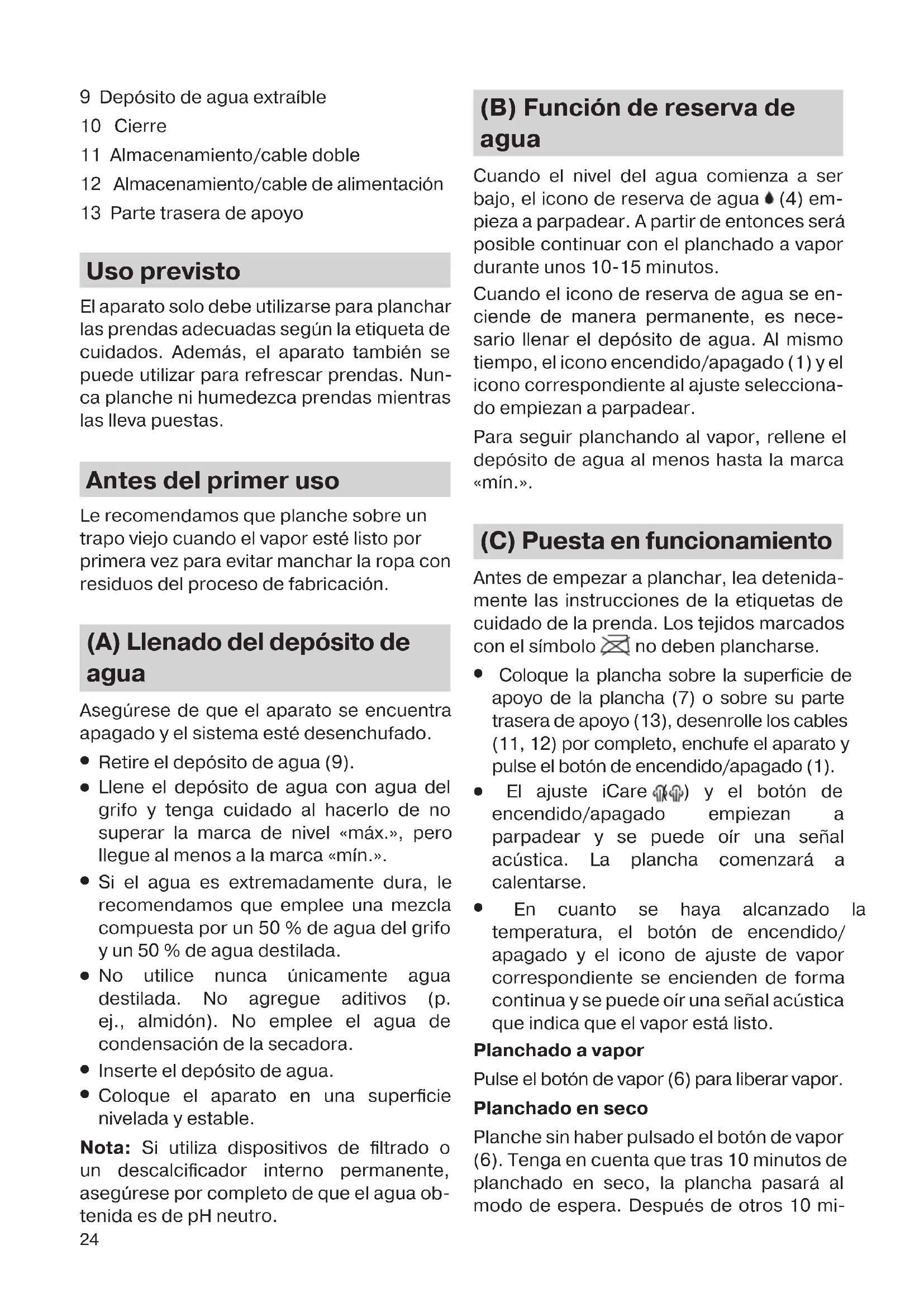 Coloque el aparato en una superficie nivelada y estable. Nota: Si utiliza dispositivos de filtrado o un descalcificador interno permanente, asegúrese por completo de que el agua ob- tenida es de pH neutro. (B) Función de reserva de agua Cuando el nivel del agua comienza a ser bajo, el icono de reserva de agua (4) em- pieza a parpadear. A partir de entonces será posible continuar con el planchado a vapor durante unos 10-15 minutos. Cuando el icono de reserva de agua se en- ciende de manera permanente, es nece- sario llenar el depósito de agua. Al mismo tiempo, el icono encendido/apagado (1) y el icono correspondiente al ajuste selecciona- do empiezan a parpadear. Para seguir planchando al vapor, rellene el depósito de agua al menos hasta la marca «mín.». (C) Puesta en funcionamiento Antes de empezar a planchar, lea detenida- mente las instrucciones de la etiquetas de cuidado de la prenda. Los tejidos marcados con el símbolo no deben plancharse.