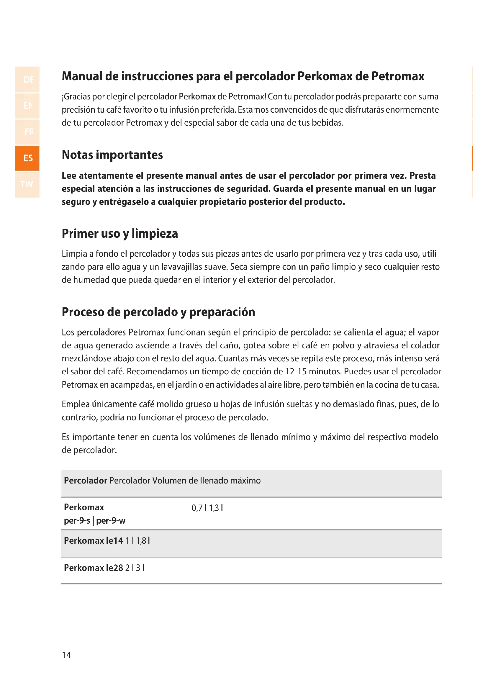 Manual de instrucciones para el percolador Perkomax de Petromax ¡Gracias por elegir el percolador Perkomax de Petromax! Con tu percolador podrás prepararte con suma precisión tu café favorito o tu infusión preferida. Estamos convencidos de que disfrutarás enormemente de tu percolador Petromax y del especial sabor de cada una de tus bebidas. Notas importantes Lee atentamente el presente manual antes de usar el percolador por primera vez. Presta especial atención a las instrucciones de seguridad. Guarda el presente manual en un lugar seguro y entrégaselo a cualquier propietario posterior del producto. Primer uso y limpieza Limpia a fondo el percolador y todas sus piezas antes de usarlo por primera vez y tras cada uso, utili- zando para ello agua y un lavavajillas suave. Seca siempre con un paño limpio y seco cualquier resto de humedad que pueda quedar en el interior y el exterior del percolador. Proceso de percolado y preparación Los percoladores Petromax funcionan según el principio de percolado: se calienta el agua; el vapor de agua generado asciende a través del caño, gotea sobre el café en polvo y atraviesa el colador mezclándose abajo con el resto del agua. Cuantas más veces se repita este proceso, más intenso será el sabor del café. Recomendamos un tiempo de cocción de 12-15 minutos. Puedes usar el percolador Petromax en acampadas, en el jardín o en actividades al aire libre, pero también en la cocina de tu casa. Emplea únicamente café molido grueso u hojas de infusión sueltas y no demasiado finas, pues, de lo contrario, podría no funcionar el proceso de percolado. Es importante tener en cuenta los volúmenes de llenado mínimo y máximo del respectivo modelo de percolador. Percolador Percolador Volumen de llenado máximo Perkomax per-9-s | per-9-w 0,7 l 1,3 l Perkomax le14 1 l 1,8 l Perkomax le28 2 l 3 l15